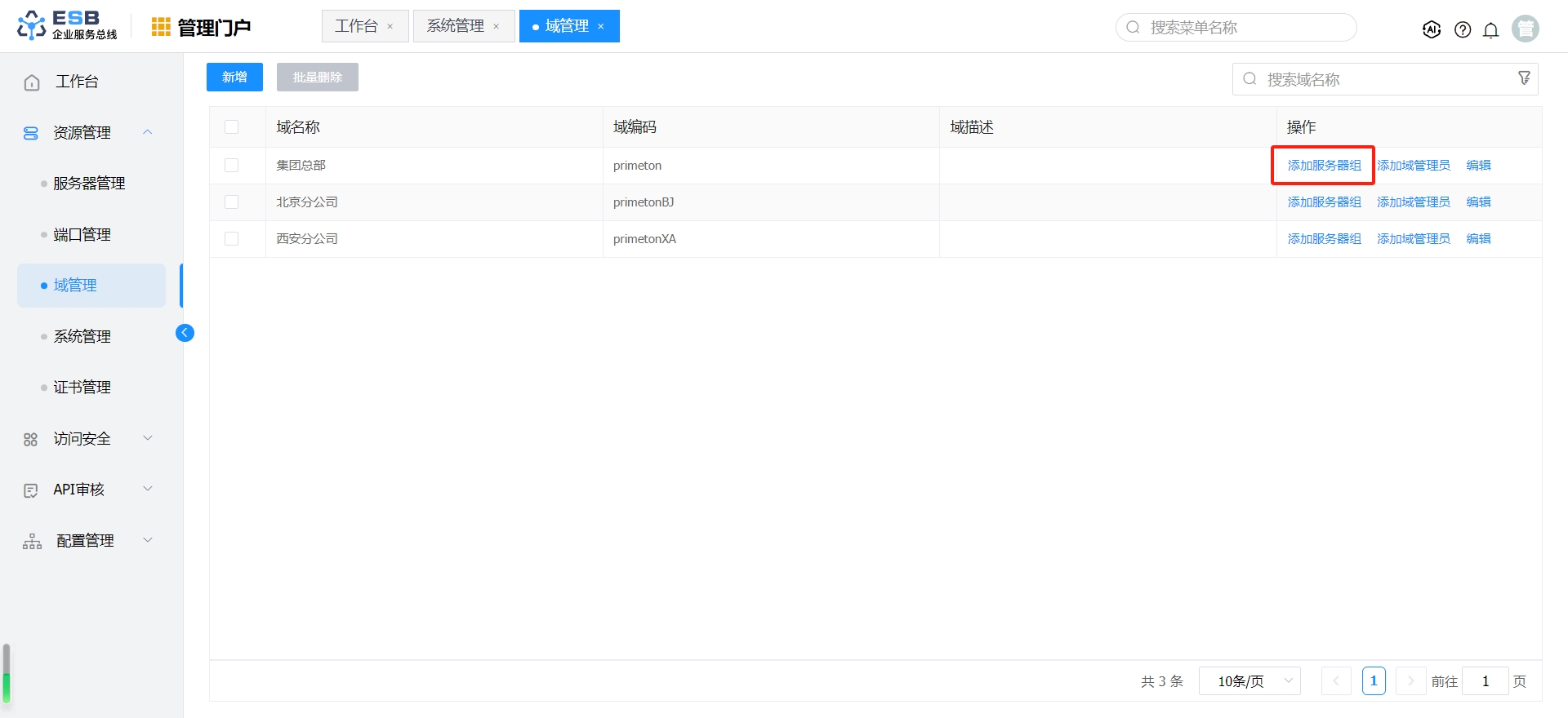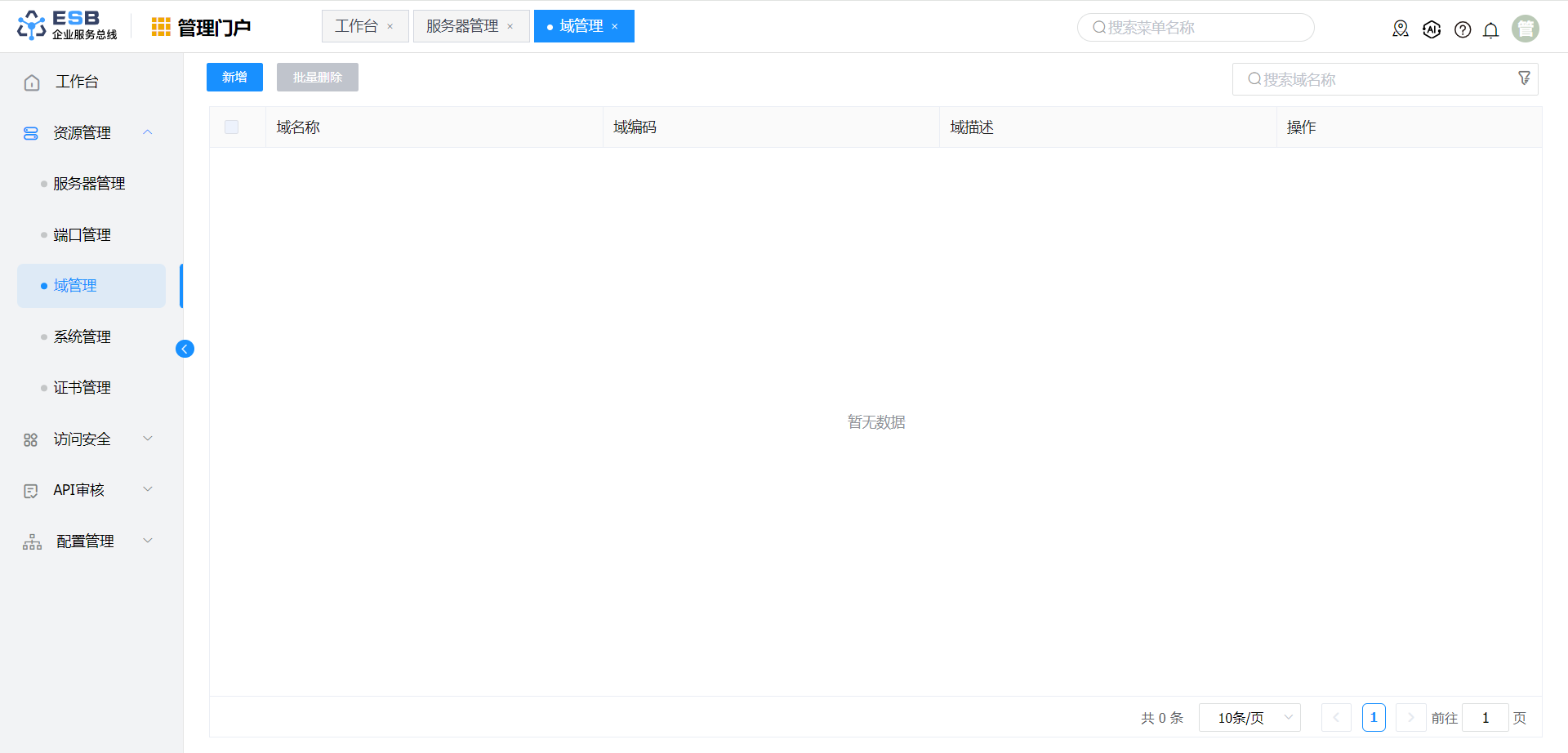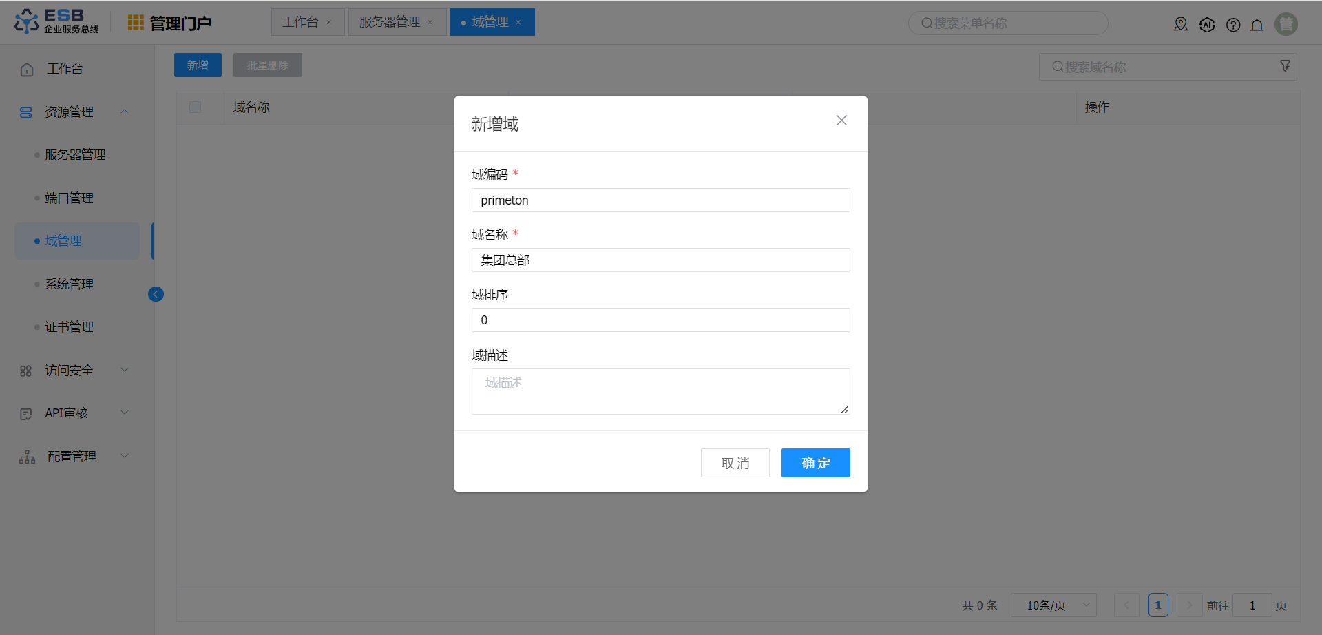 单击"管理门户->资源管理->域管理",右侧显示域管理界面,点击“新增”,弹出新增域界面。