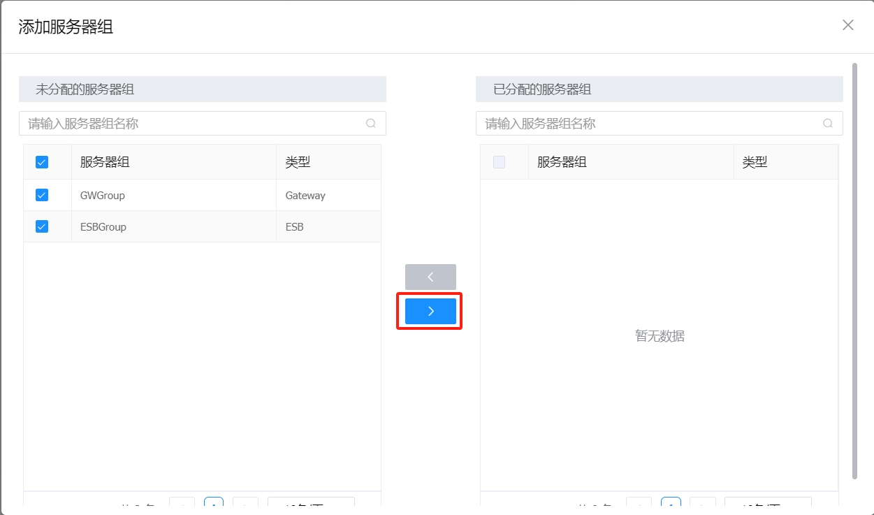 在左侧选择未分配的服务器组,点击“>”按钮,为域分配服务器组,每个域下的接口只能发布到已分配的服务器组。