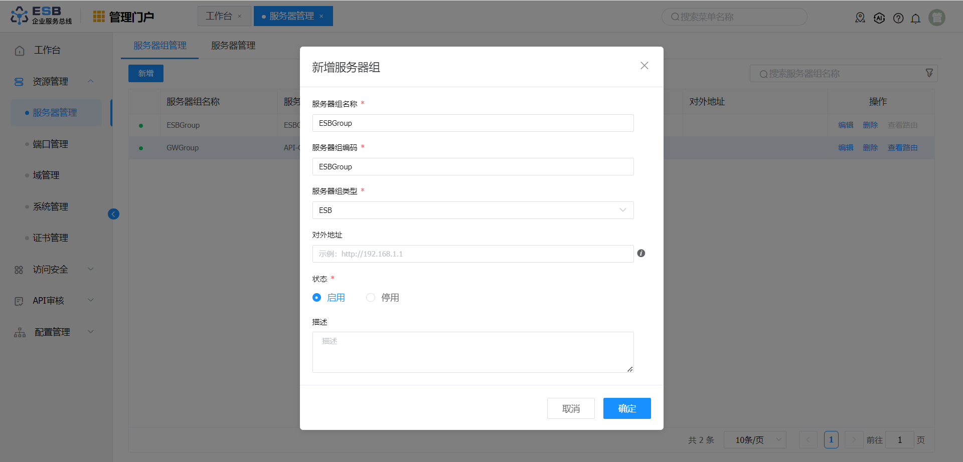 使用manager账号(默认密码:000000)登录系统,单击"管理门户->资源管理->服务器管理",选中右侧显示的"服务器组管理"界面,点击新增,输入相关参数。