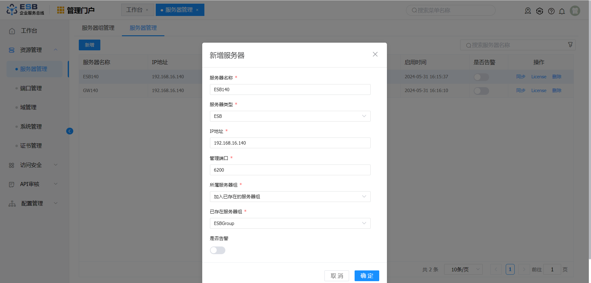 单击"管理门户->资源管理->服务器管理",选中右侧显示的"服务器管理"界面,点击新增,输入相关参数。