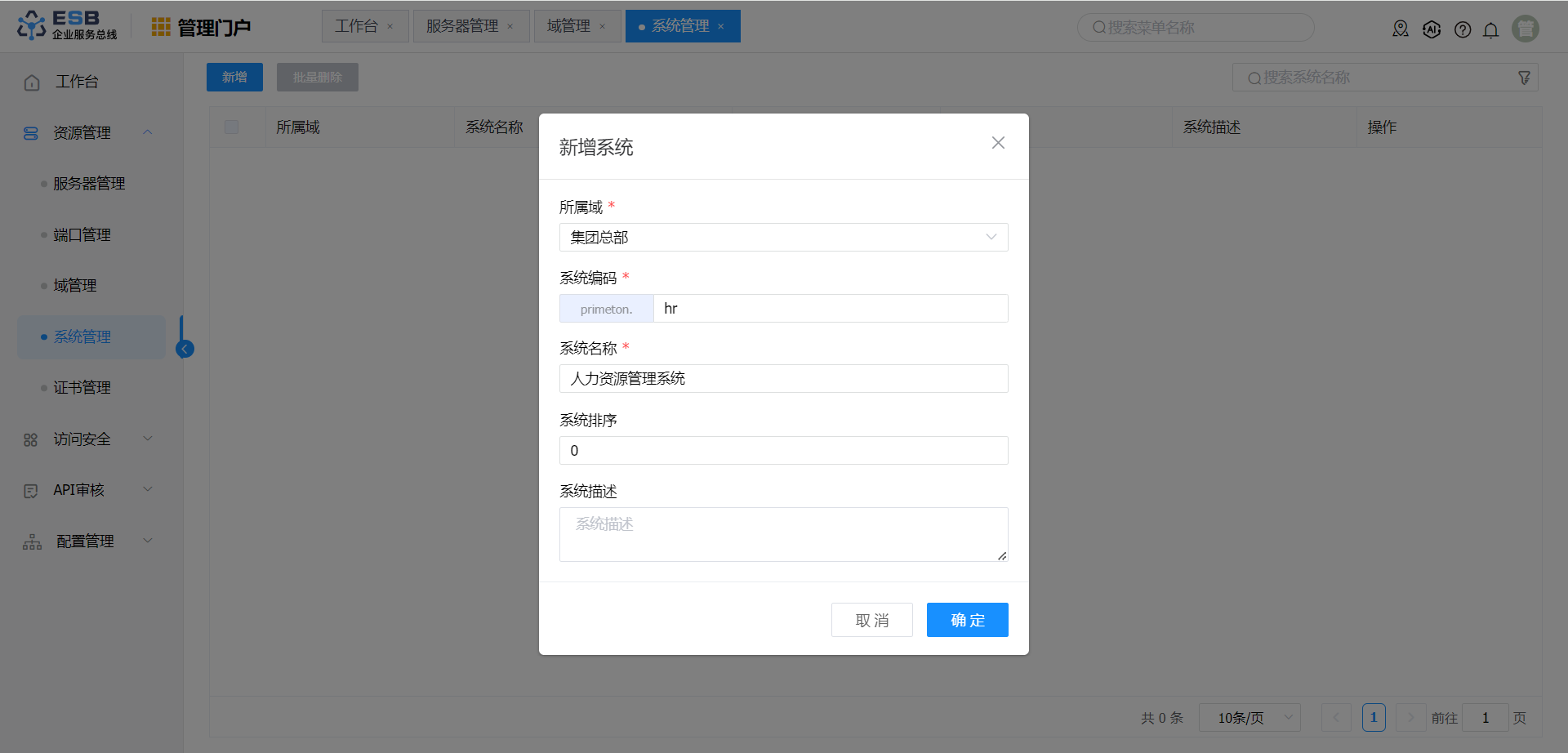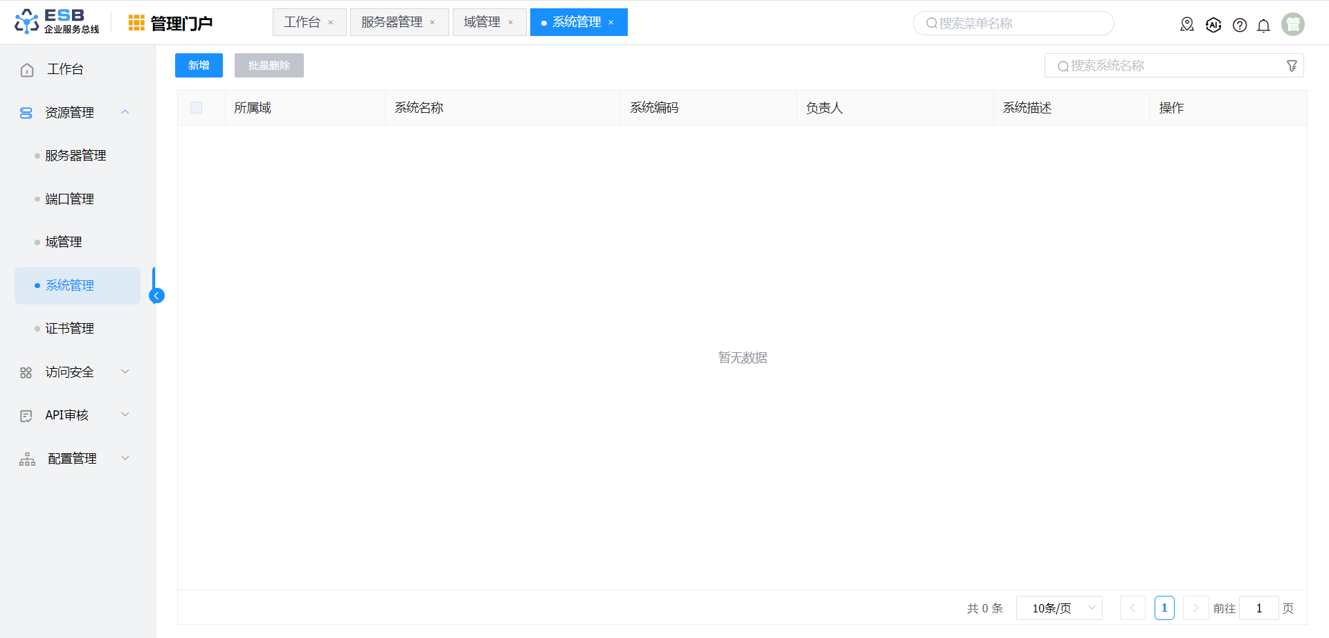 单击"管理门户->资源管理->系统管理",右侧显示系统管理界面,点击“新增”,进入“新增系统”界面。