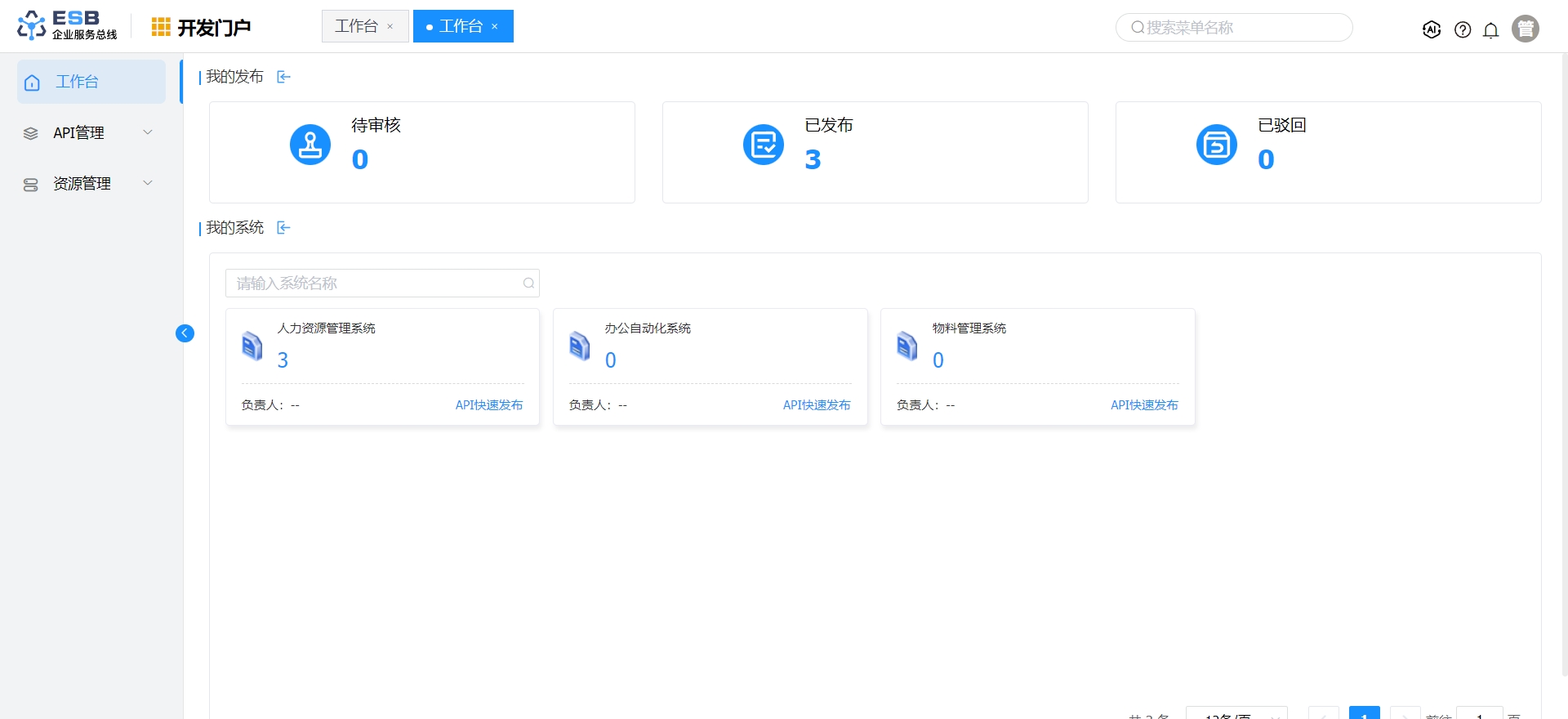 在完成创建服务器组、创建服务器、创建域、为域分配服务器组、创建系统这些操作后,单击“开发门户”,进入开发门户工作台。