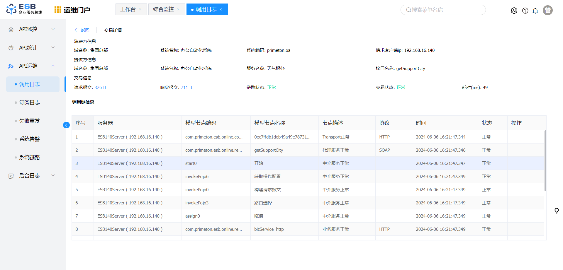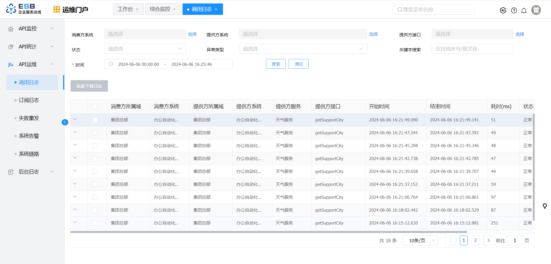 在运维门户,选择”API运维 -> 调用日志”菜单,进入到”调用日志”页面。