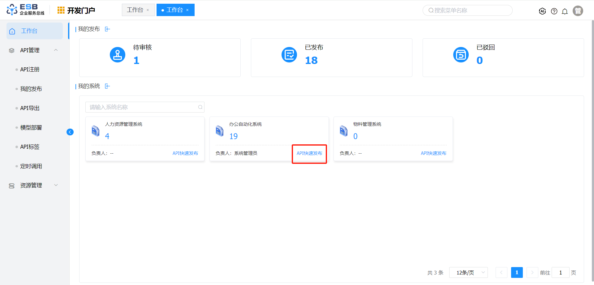 “工作台”页面,在“我的系统”页签中,点击系统卡片上的“API快速发布“按钮,弹出“API快速发布“弹窗。