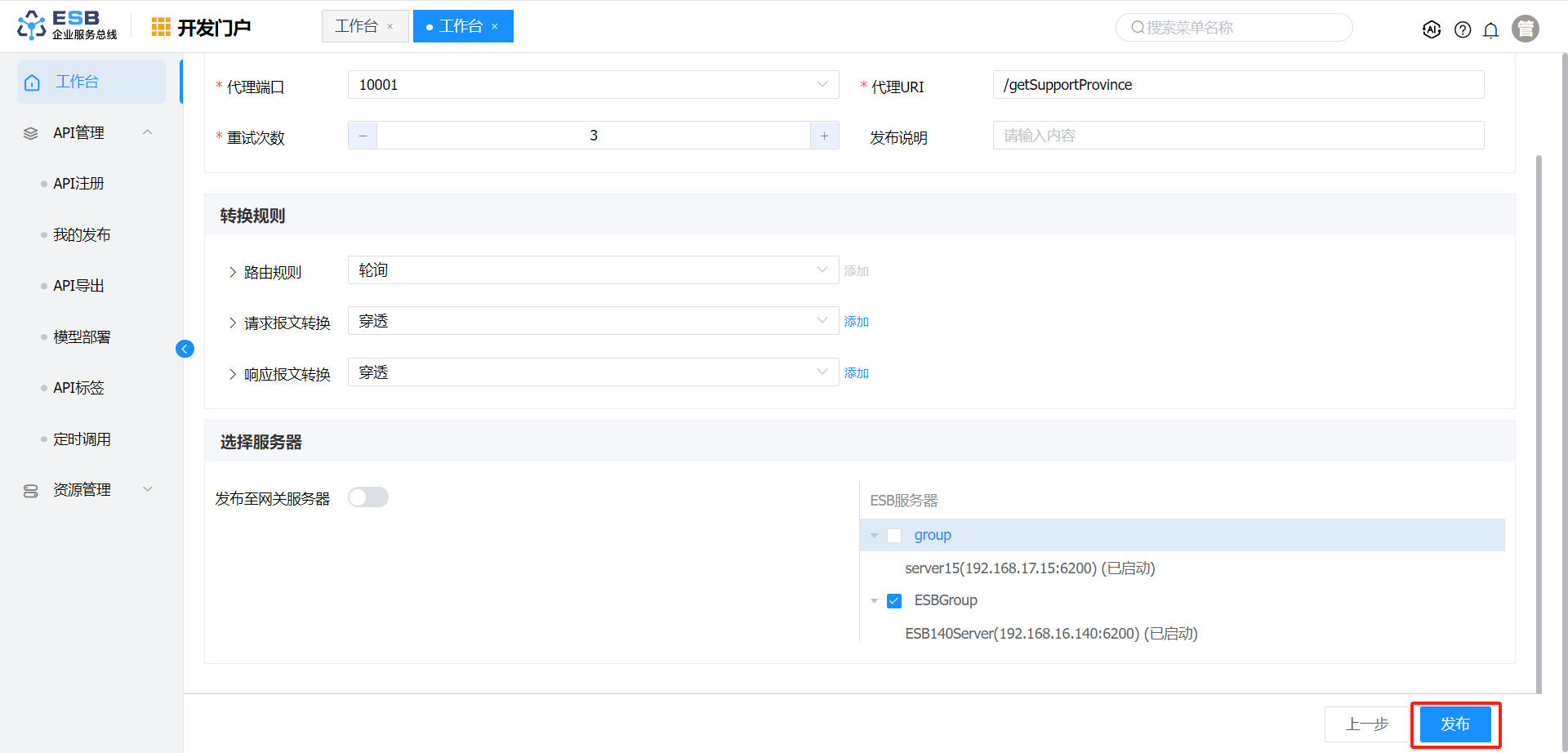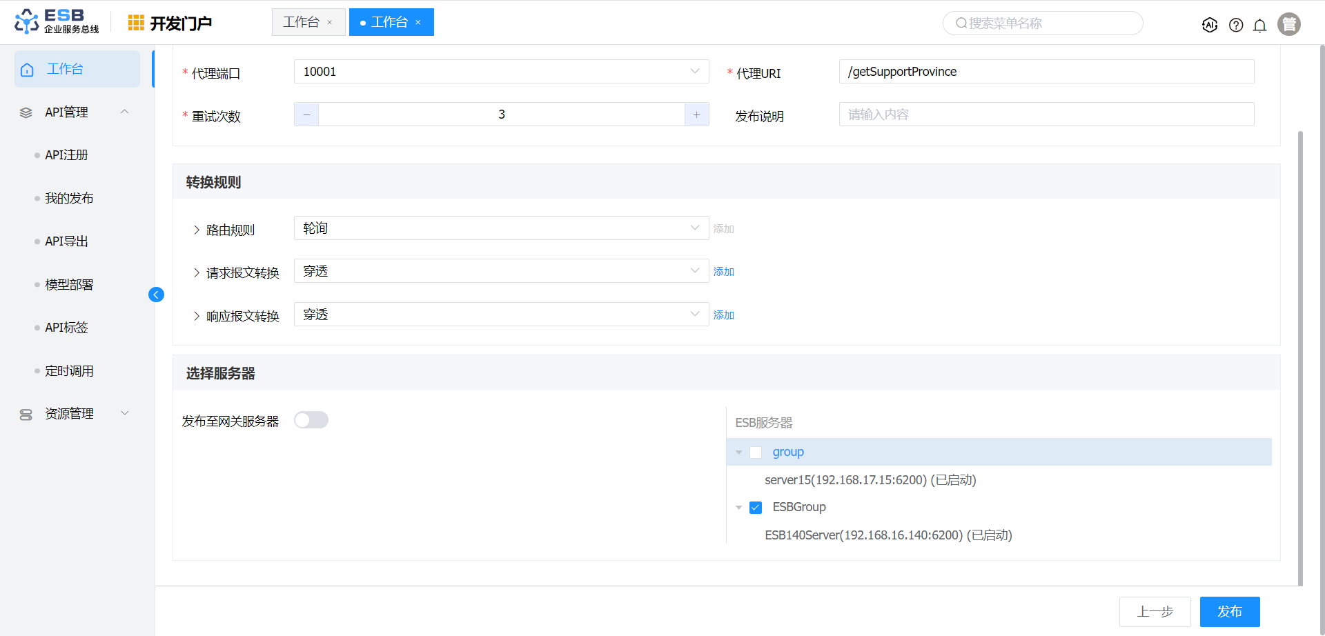 选择”代理端口”,填写”代理URI”,这里填写上一步选择接口的名称作为代理URI,选择ESB服务器,即可完成接口信息配置。