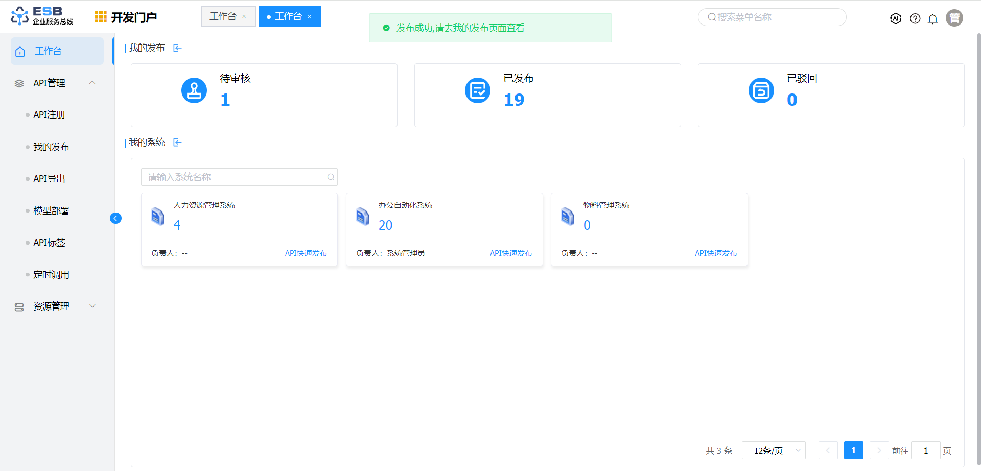 - 发布成功后,系统会自动跳转到”工作台”页面,显示发布成功信息。