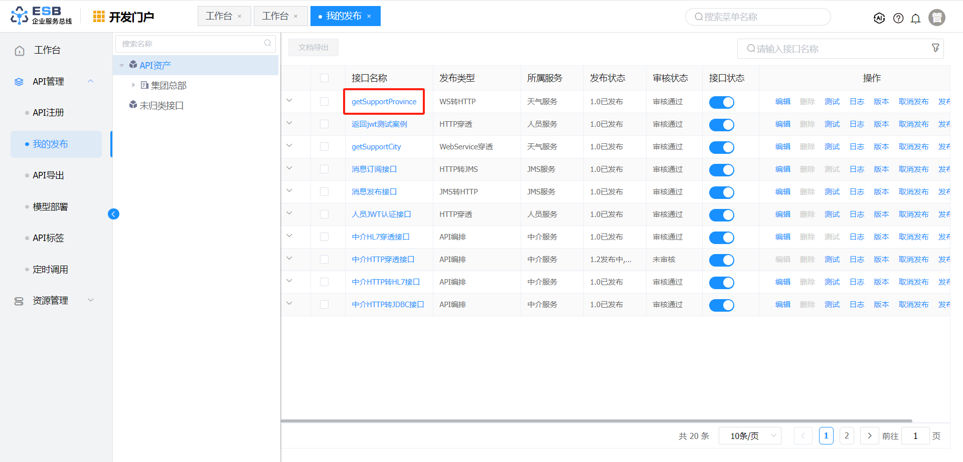 在”开发门户”,点击”API管理 -> 我的发布”菜单,进入到”我的发布”页面,可以查看刚才发布的接口信息。