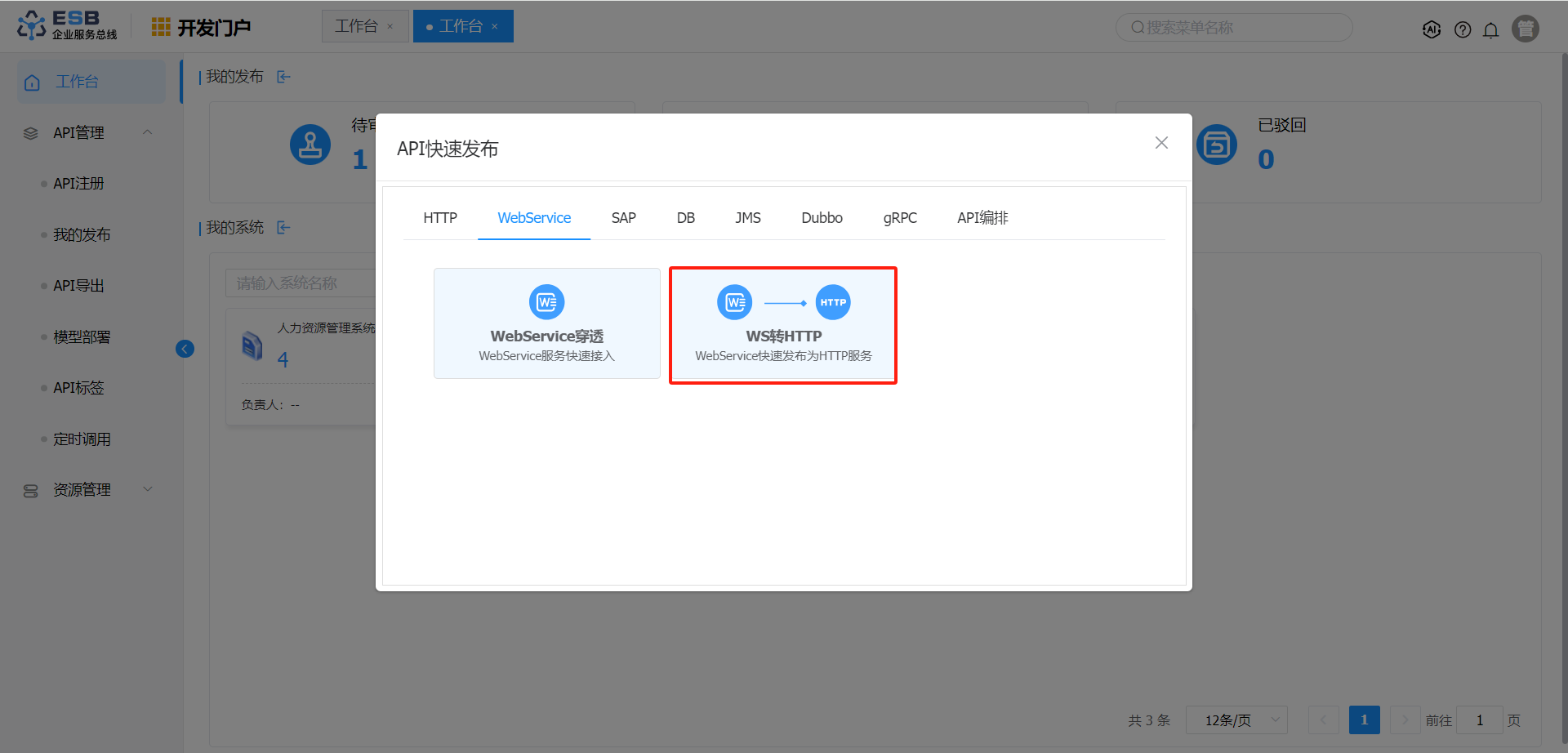 “API快速发布“弹窗,选择”WebService“页签,点击”WS转HTTP“按钮,进入”WS转HTTP“页面。