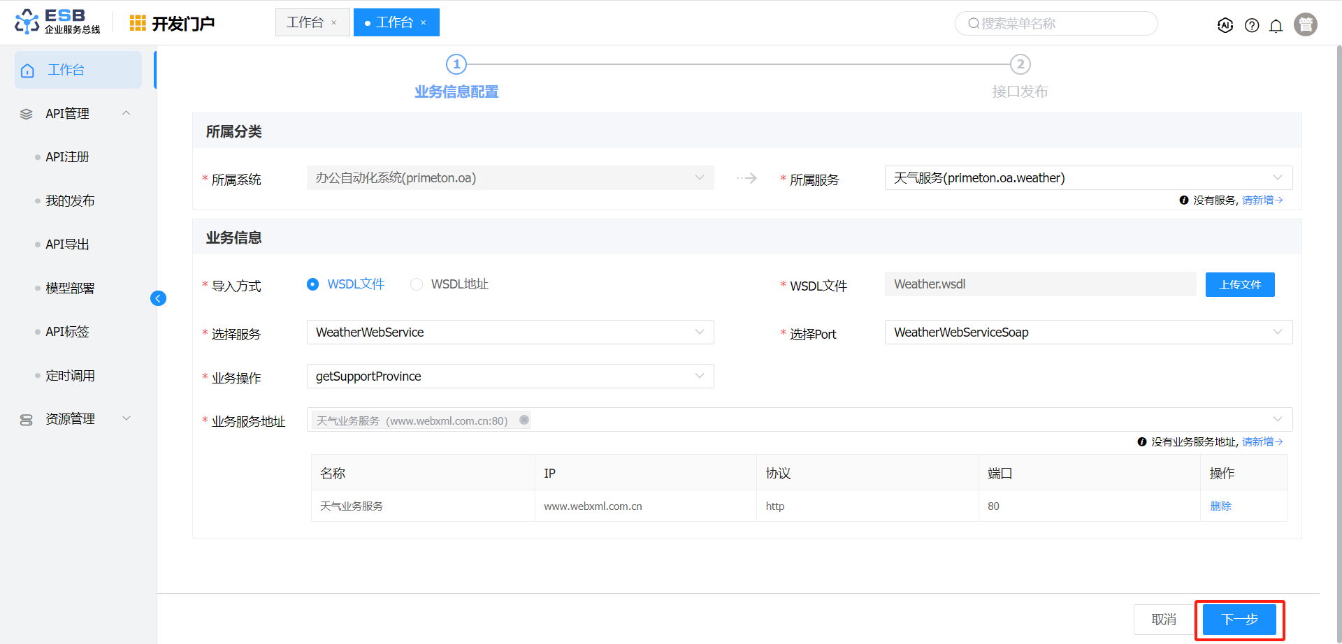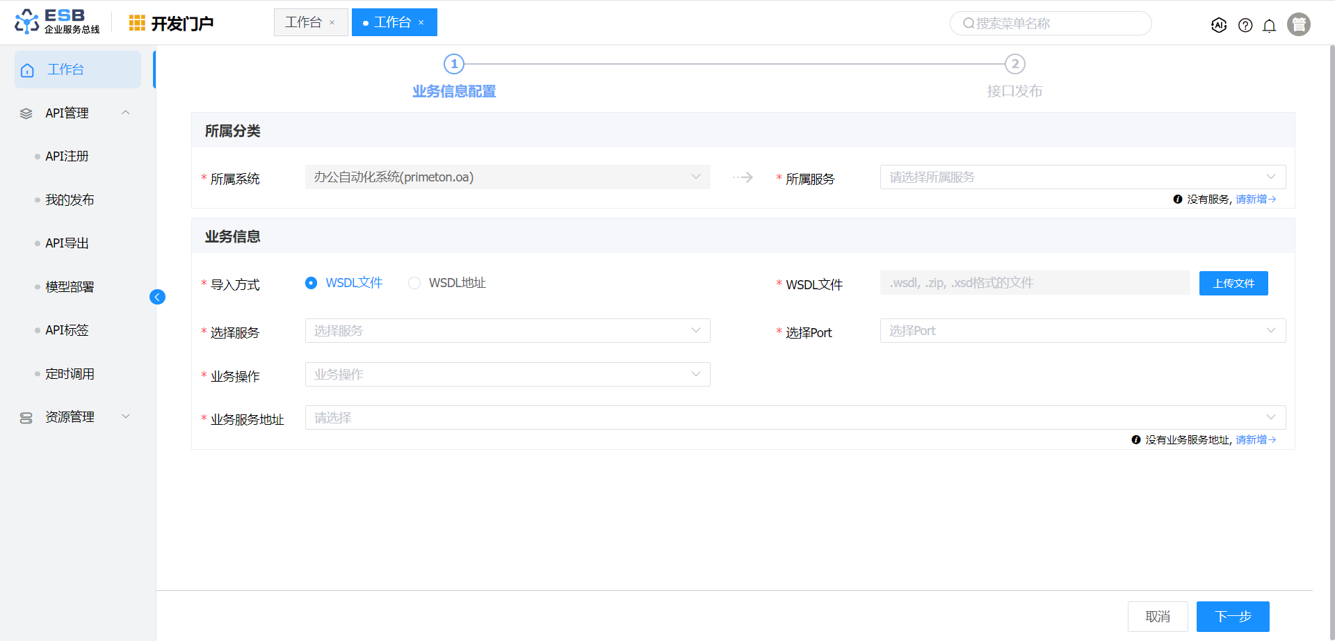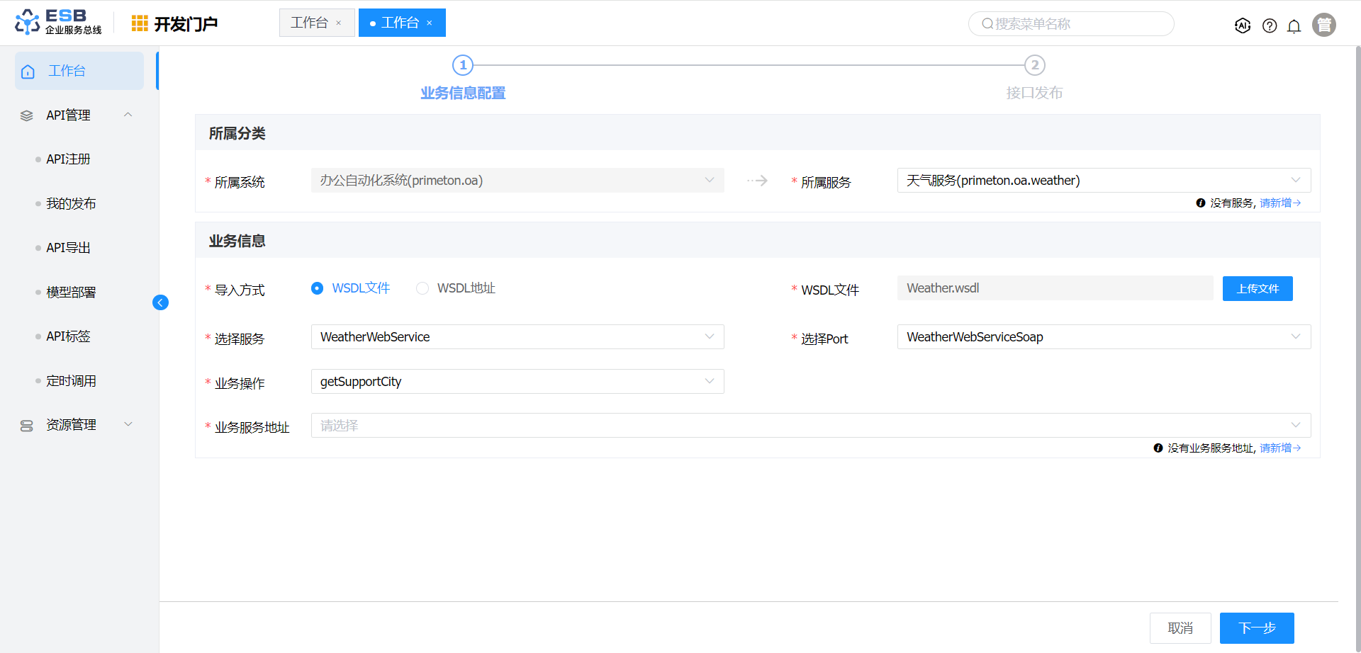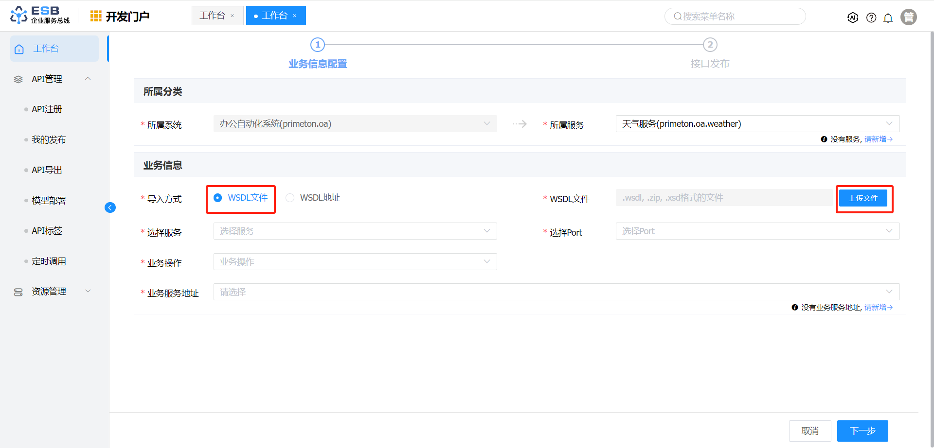 在业务信息模块的”WSDL文件”处,选择上传准备好的WSDL文件,即可完成接口导入。 ”WSDL地址”操作类似,可以直接填写WSDL地址进行接口导入。