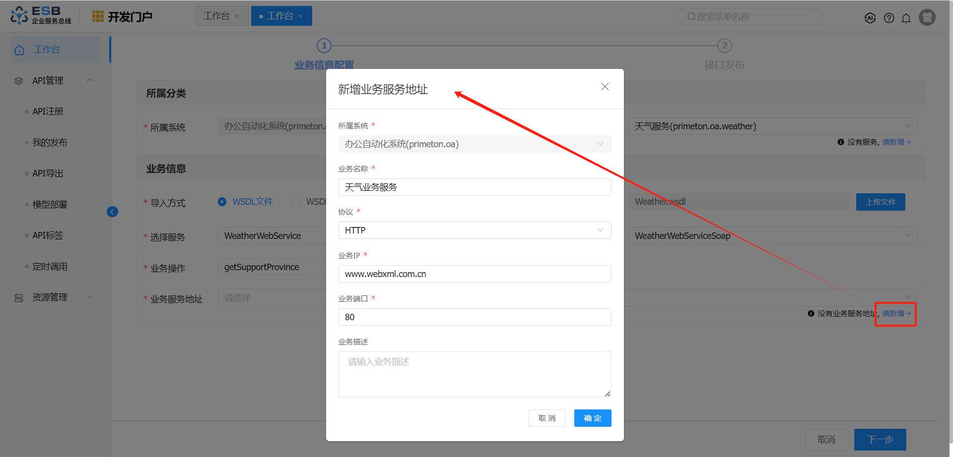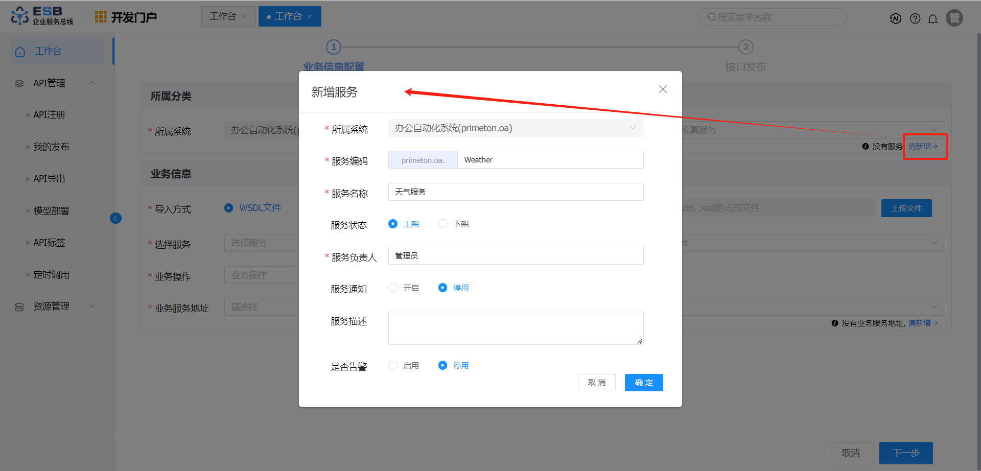 参数 说明 所属系统 API所属系统 所属服务 API所属服务,若没有对应服务,请新增服务 导入方式 WSDL文件和WSDL地址两种方式 选择服务 选择WSDL文件中所属的服务 选择Port 选择WSDL文件中所属的Port 业务操作 选择业务接口 业务服务地址 业务服务地址信息,若没有对应对应业务服务地址,请参考 步骤7 新增业务服务地址 在所属分类的所属服务处下拉选择”服务”。 如果当前没有配置”服务”,因此需要先点击所属服务下拉框下方的”请新增”按钮,进入到”新增服务”页面。 填写服务相关信息,点击”确定”按钮,完成新增服务。