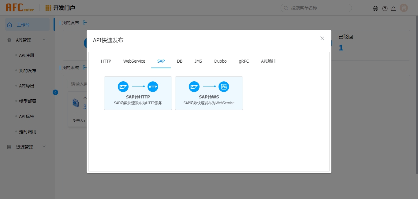 2. “工作台”页面,在“我的系统”页签中,选择系统点击“API快速发布”,在“API快速发布“弹窗,选择”SAP“页签。