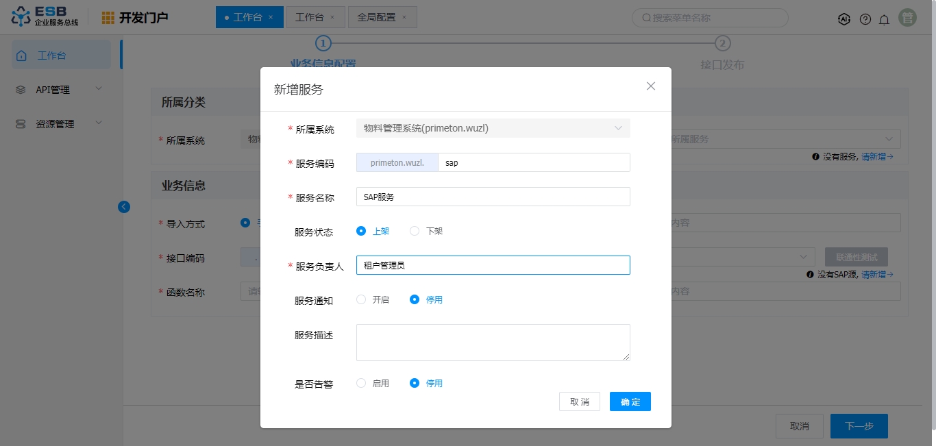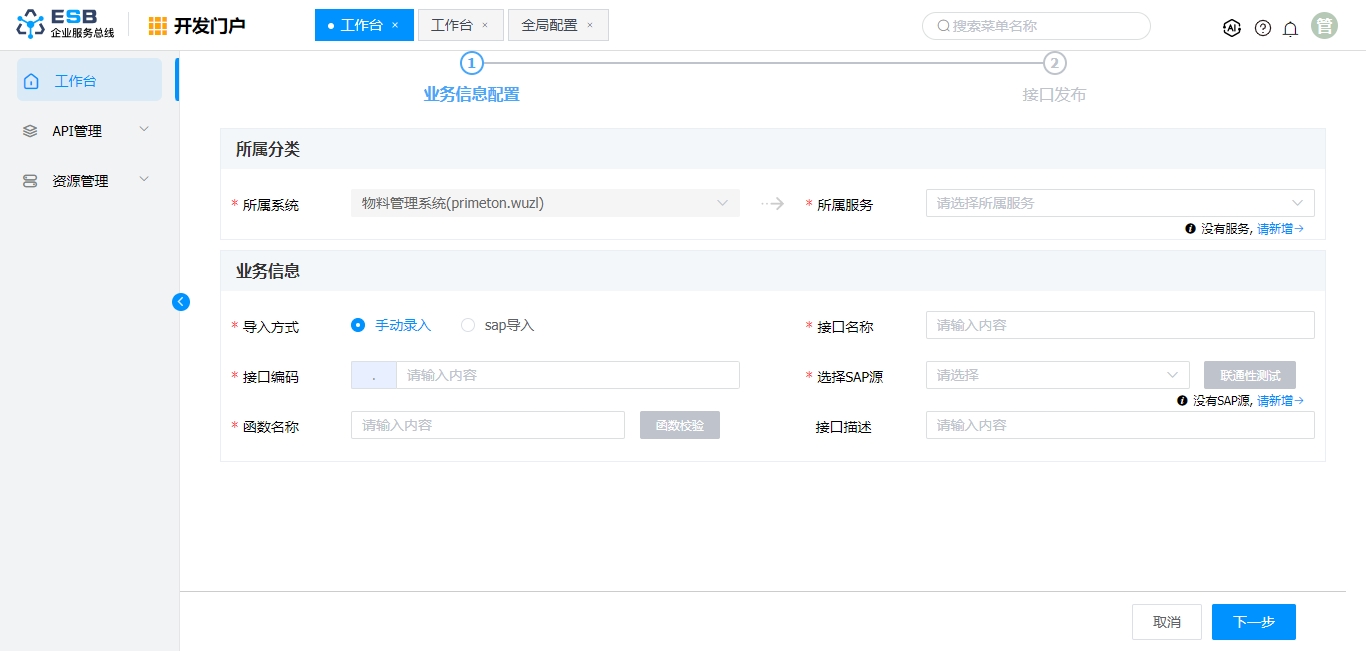 4. ”SAP发布“页面,参考字段说明表格,填写“业务信息配置”页签中内容(此场景中”导入方式“选择”手动录入“, 如没有所需的服务与SAP源,在此页面可快速新增服务,SAP源等信息)
