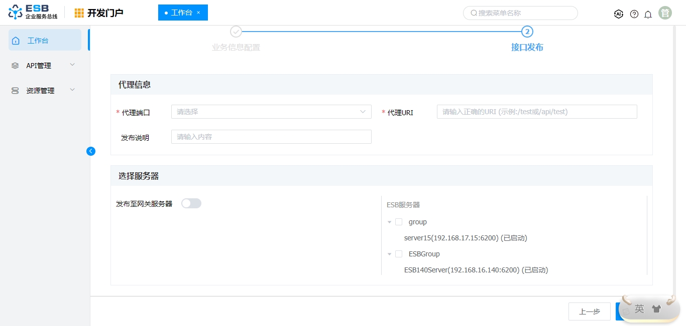 ESB服务器 选择ESB服务器组,发布接口