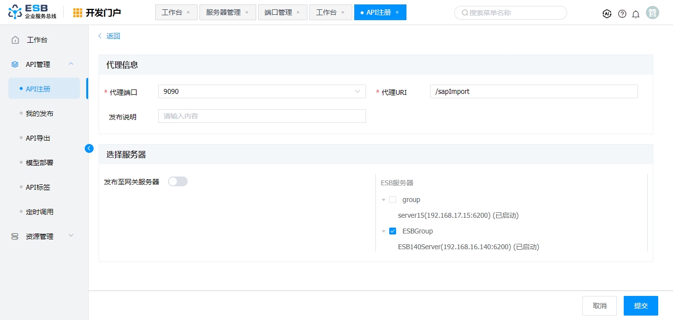 | ESB服务器 | 选择ESB服务器组,发布接口 |