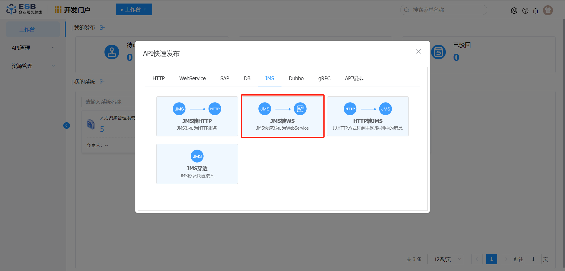 3.“API快速发布“弹窗,选择”JMS“页签,点击”JMS转WS“按钮,进入”JMS转WS“接口发布页面