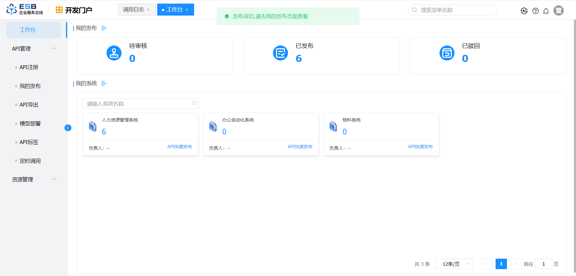 2.“工作台”页面,在“我的系统”页签中,点击系统卡片上的“API快速发布“按钮,弹出“API快速发布“弹窗。