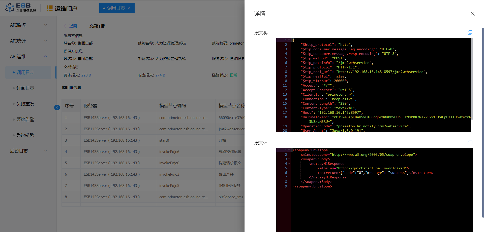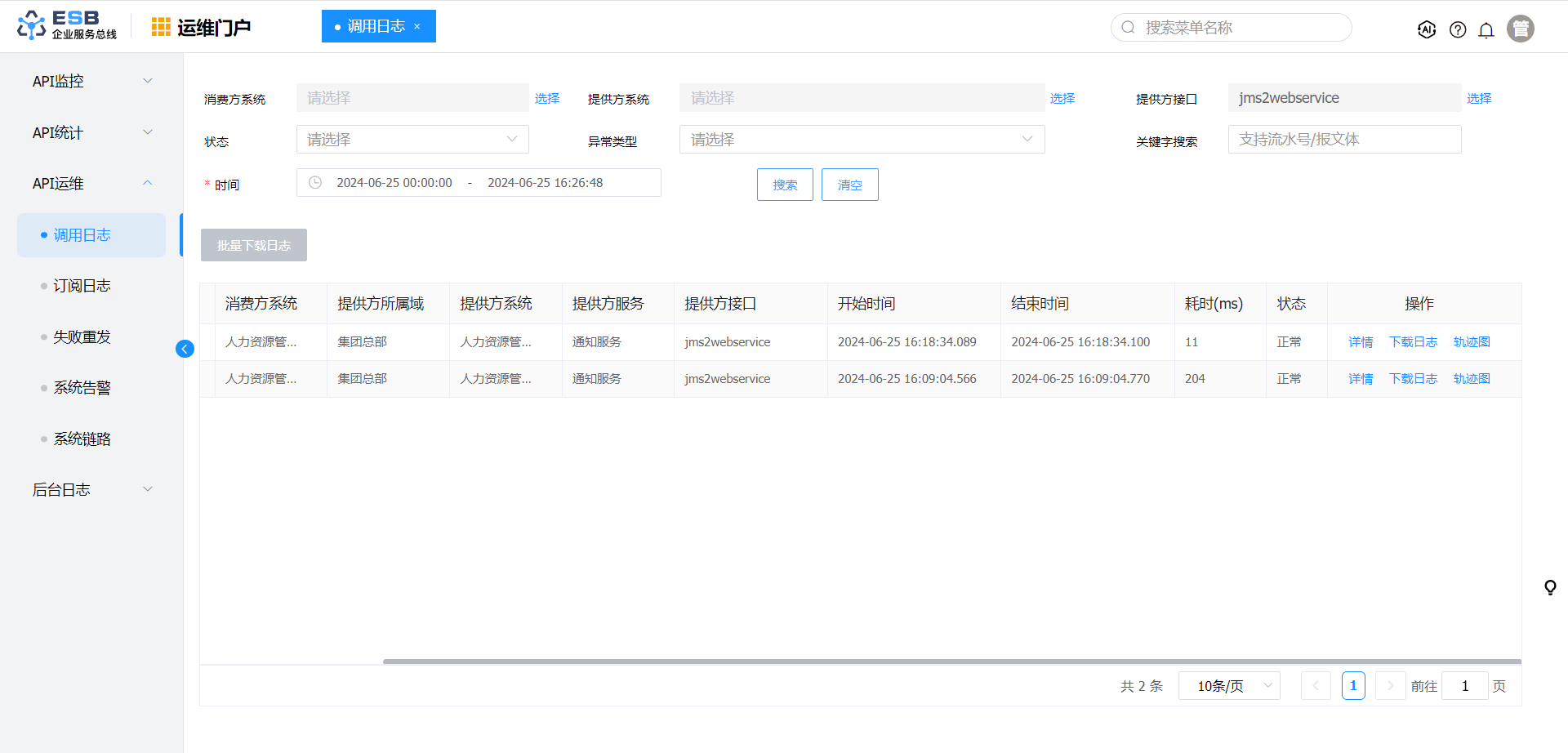 点击菜单“API运维”>"调用日志",进入“调用日志”页面。