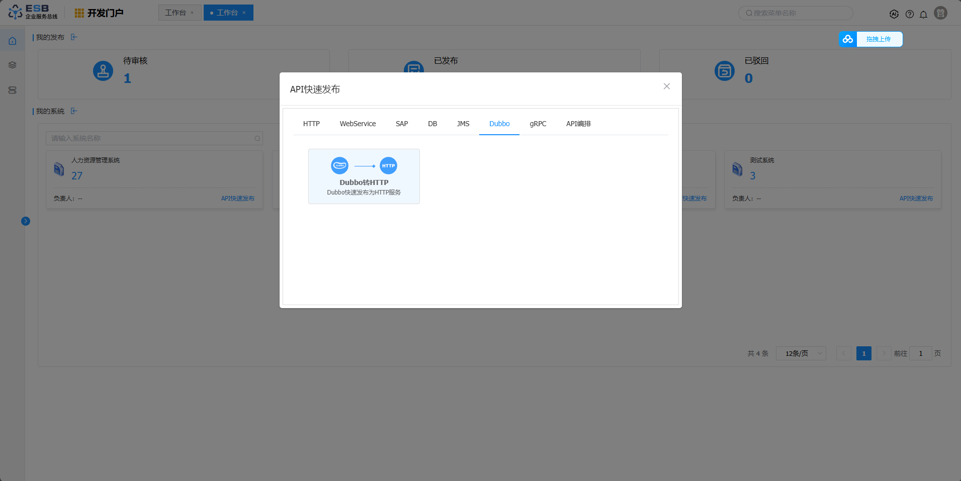 2.“工作台”页面,在“我的系统”页签中,点击系统卡片上的“API快速发布“按钮,弹出“API快速发布“弹窗。