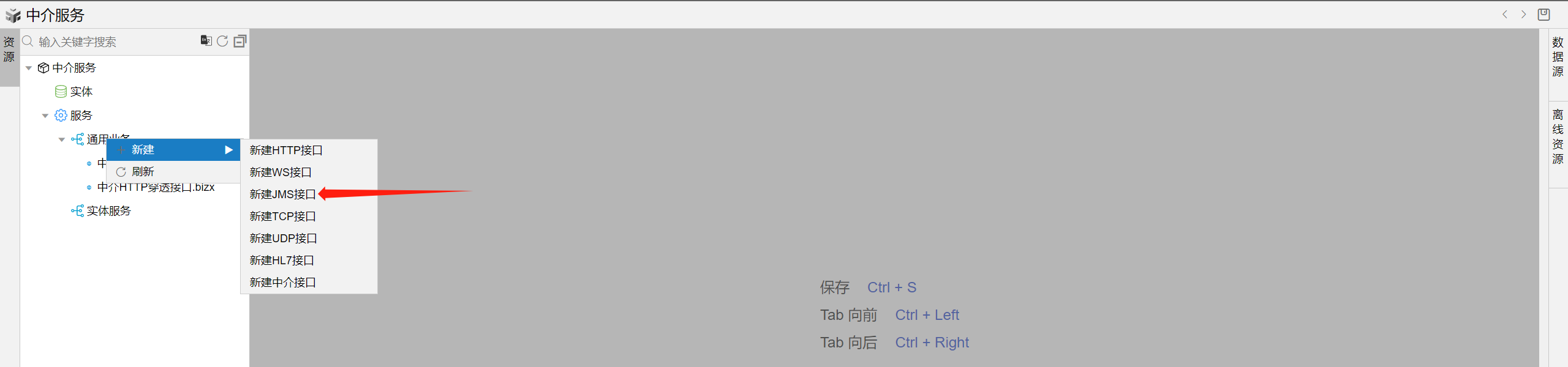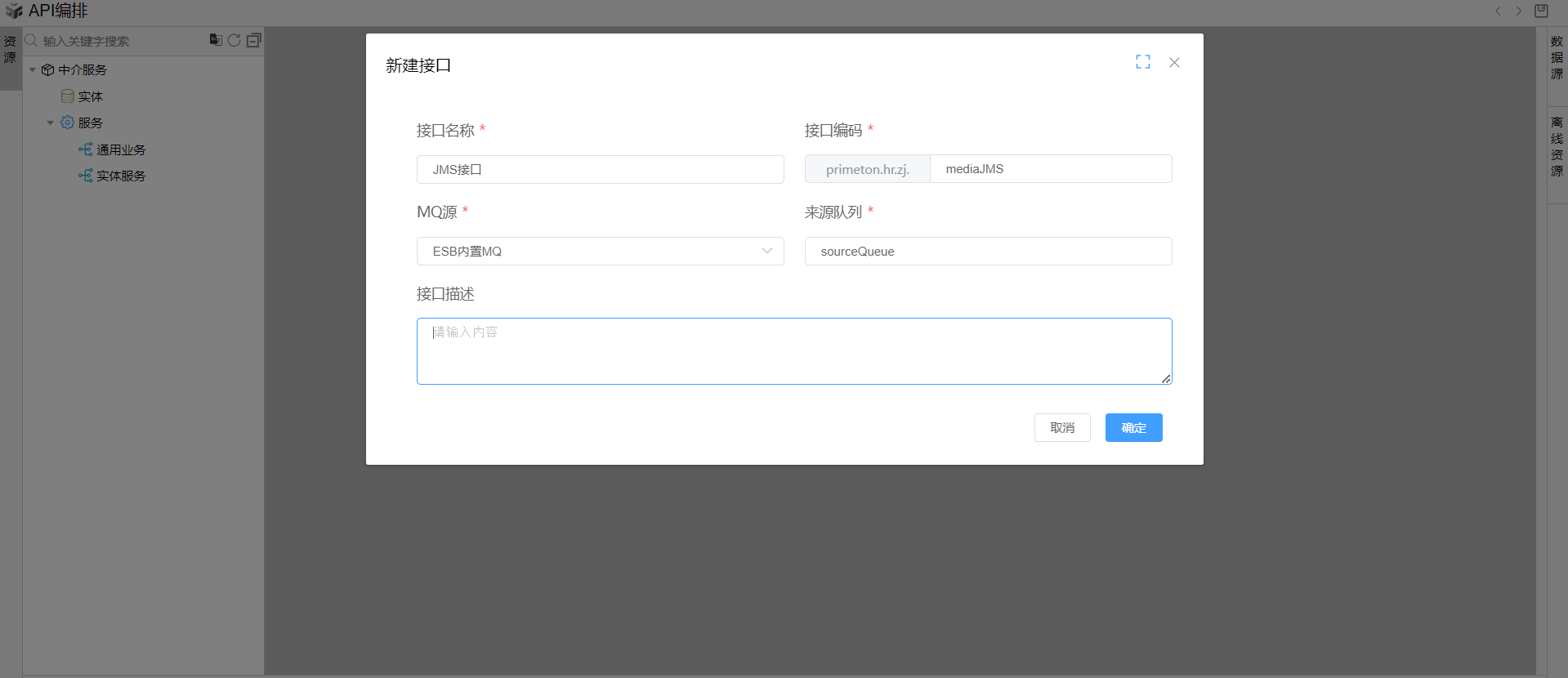 2. 在线编排页面中的通用业务目录上点击右键,点击新建并点击新建JMS接口,然后如下图所示填写数据,并点击保存确定。