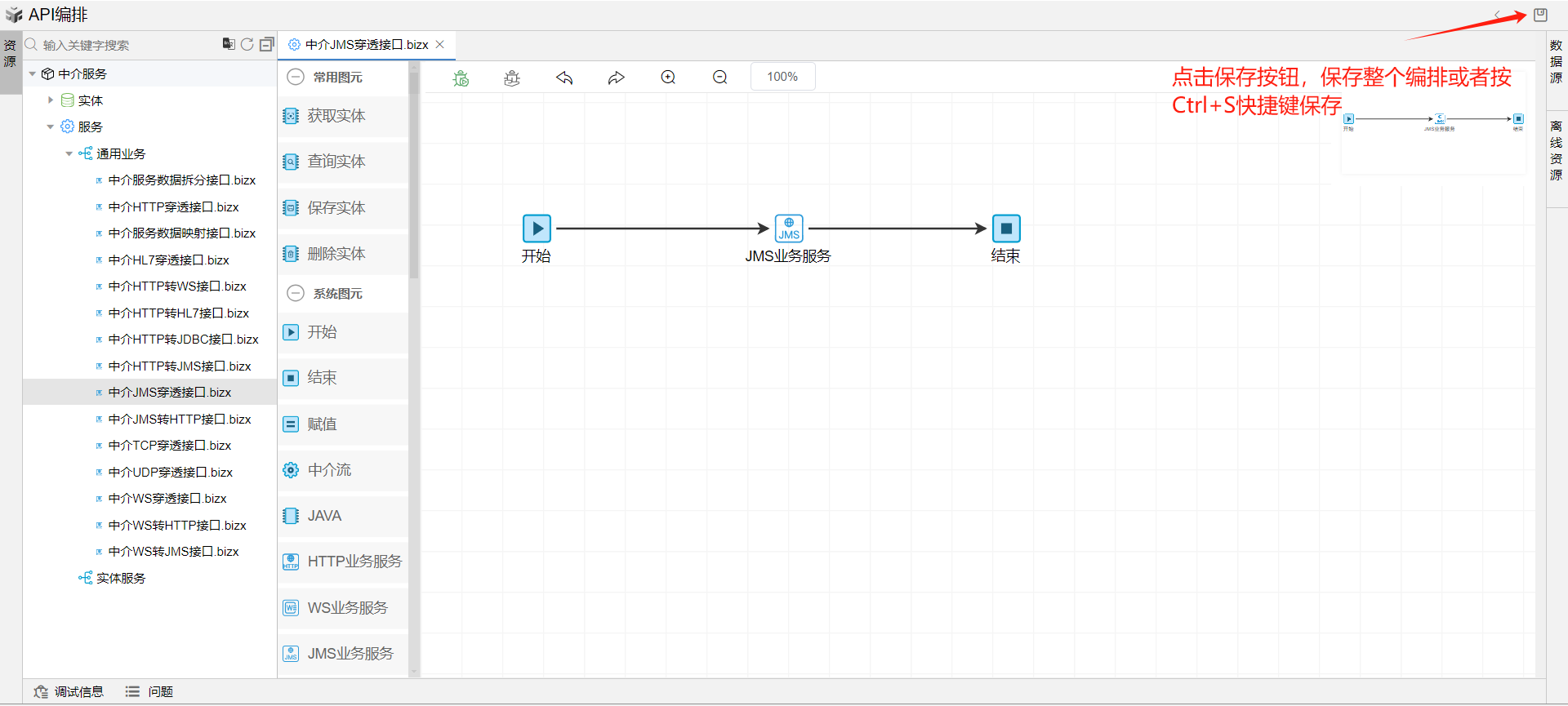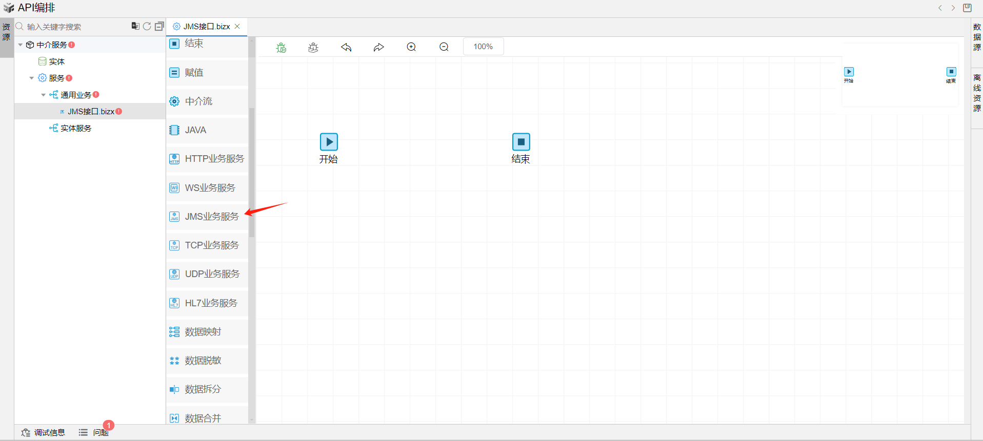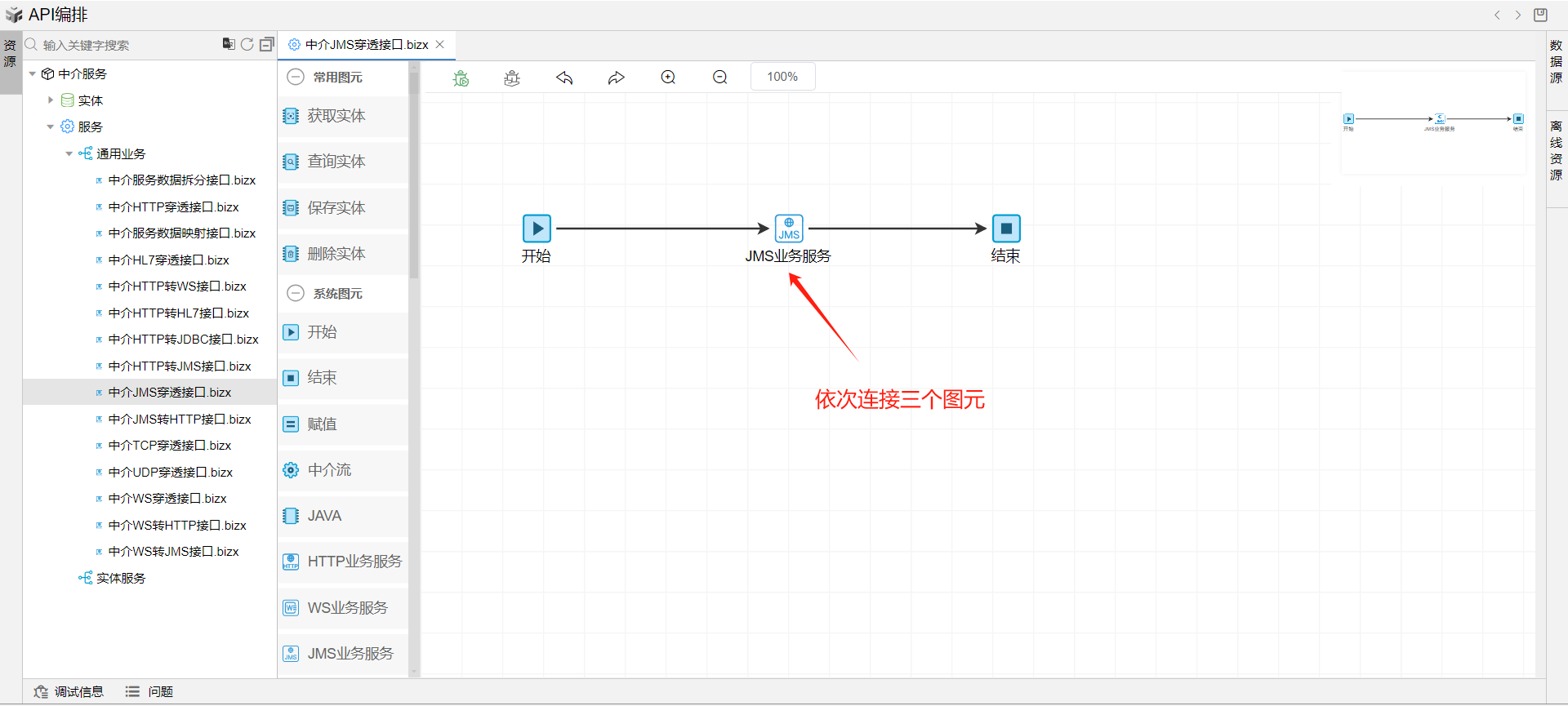 1. 保存成功后系统自动打开中介编排页面。从左侧拖一个JMS业务服务图元到开始和结束图元中间,并依次连接各个图元。如下图: