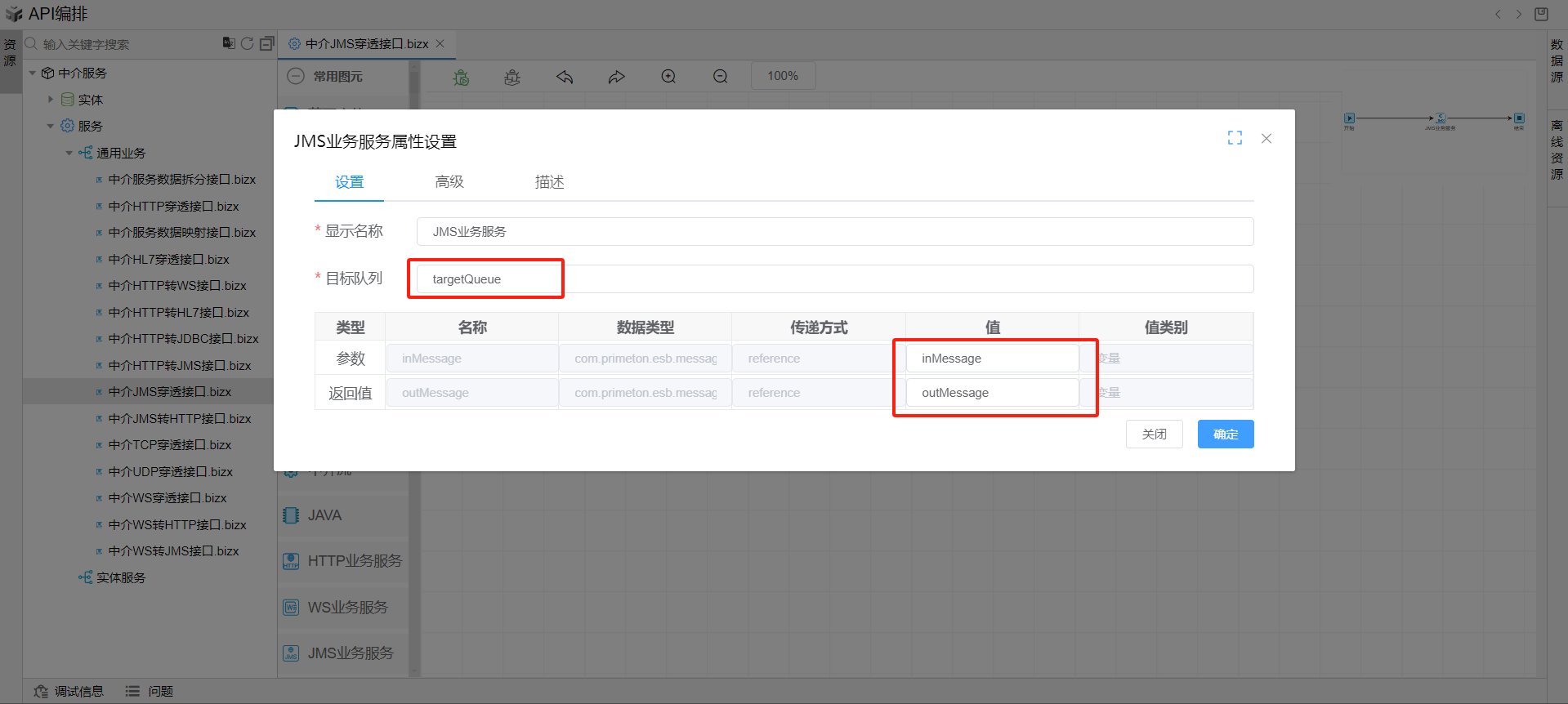 2. 双击打开JMS业务服务图元,填写目标队列名称,下方表格中的参数和返回值分别选择inMessage和outMessage,然后点击确定按钮关闭对话框。如下图:
