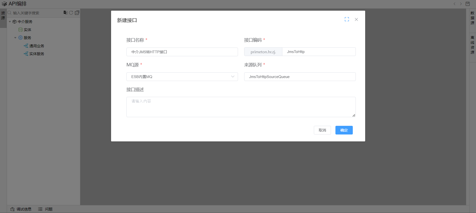 在线编排页面中的通用业务目录上点击右键,点击新建并点击新建JMS接口,然后如下图所示填写数据,并点击保存确定。
