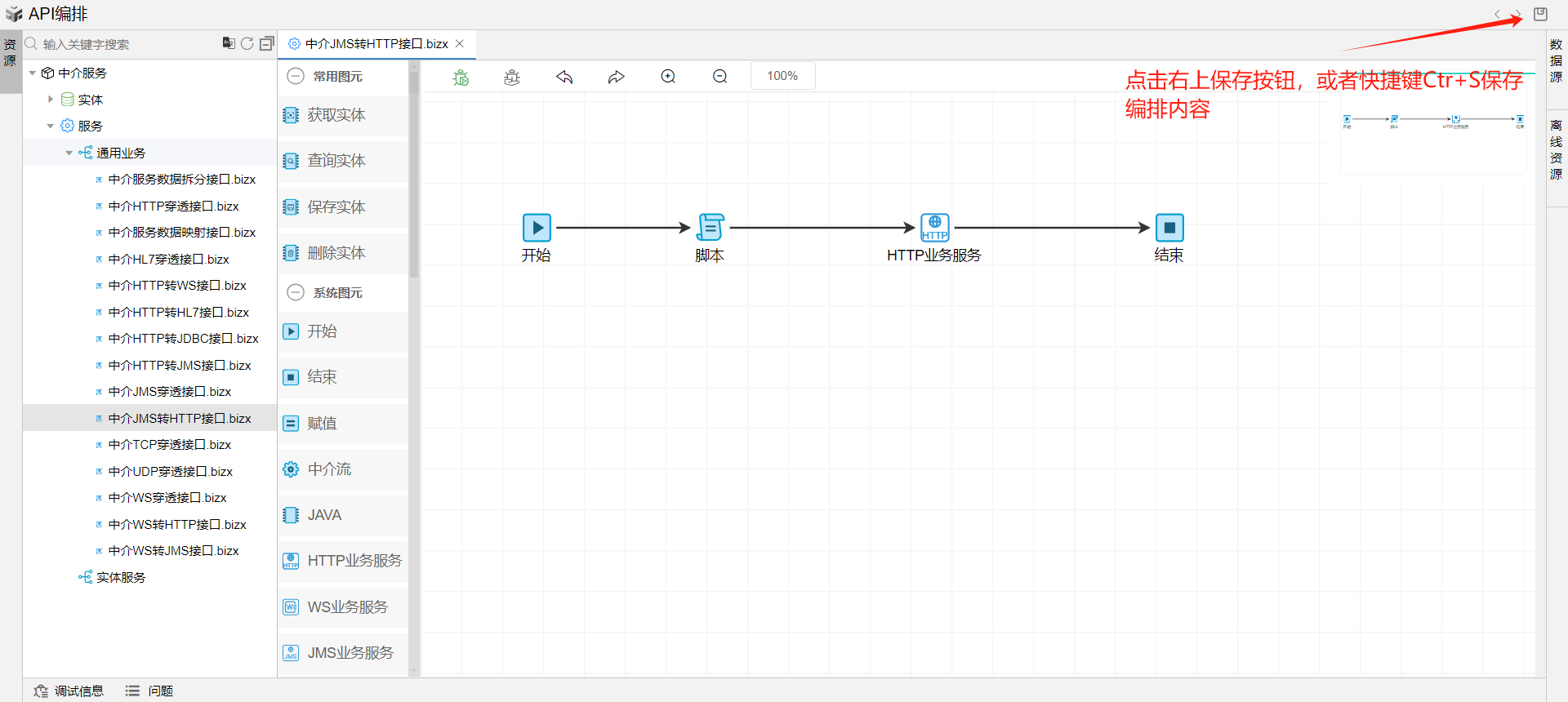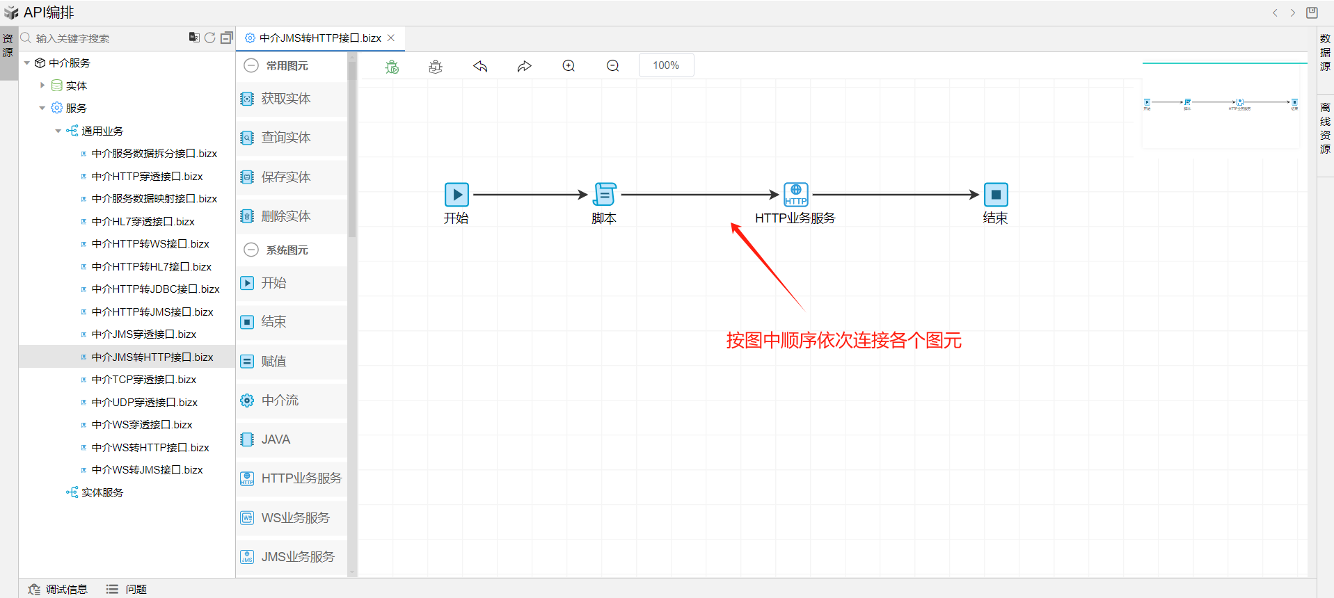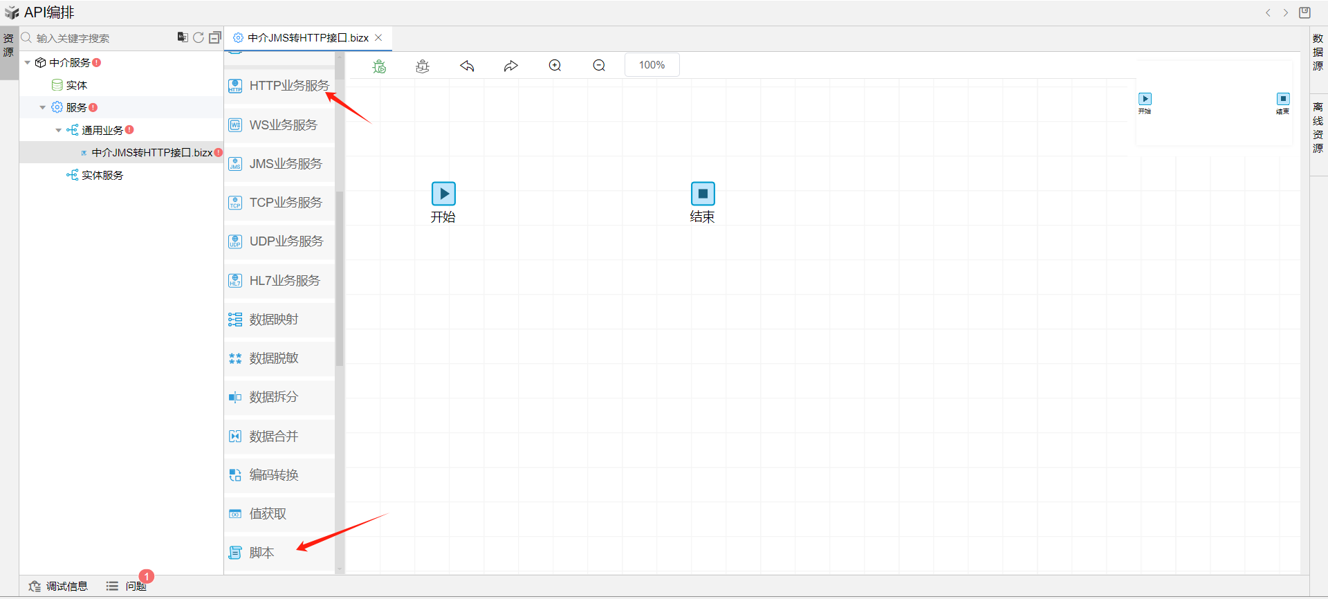 保存成功后系统自动打开中介编排页面。从左侧拖一个脚本图元和HTTP业务服务图元到开始和结束图元中间,并依次连接各个图元。如下图: