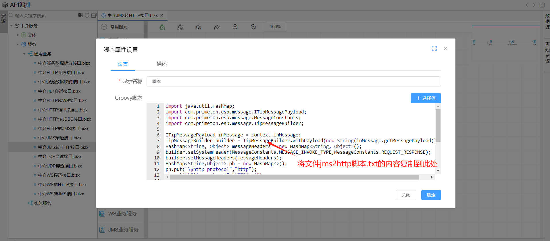双击打开脚本图元,将文件jms2http脚本.txt的内容复制到图元中,点击确定。如下图: