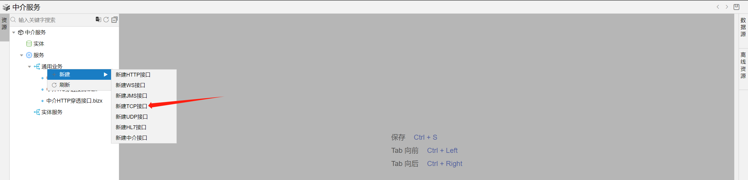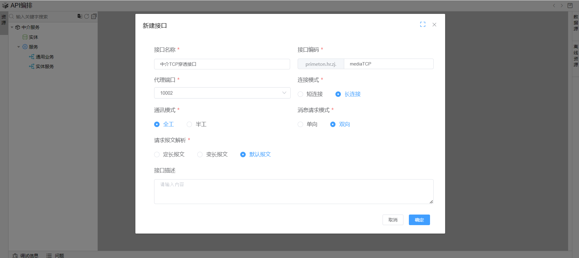 在线编排页面中的通用业务目录上点击右键,点击新建并点击新建TCP接口,然后如下图所示填写数据,并点击保存确定。
