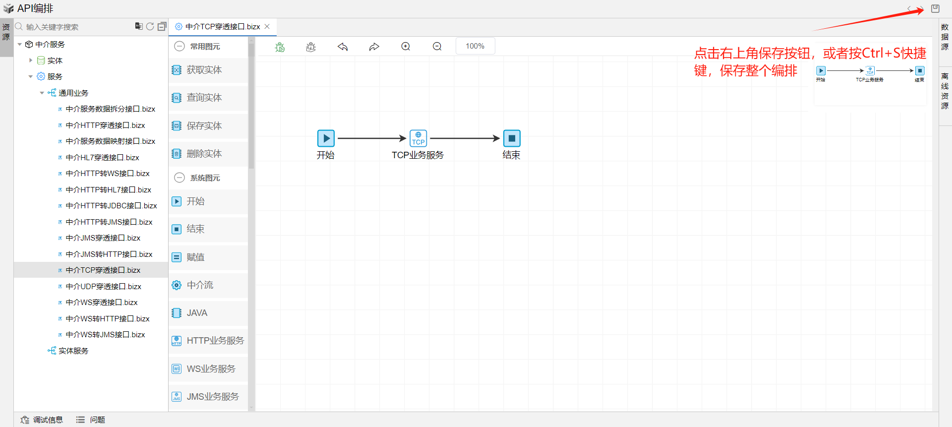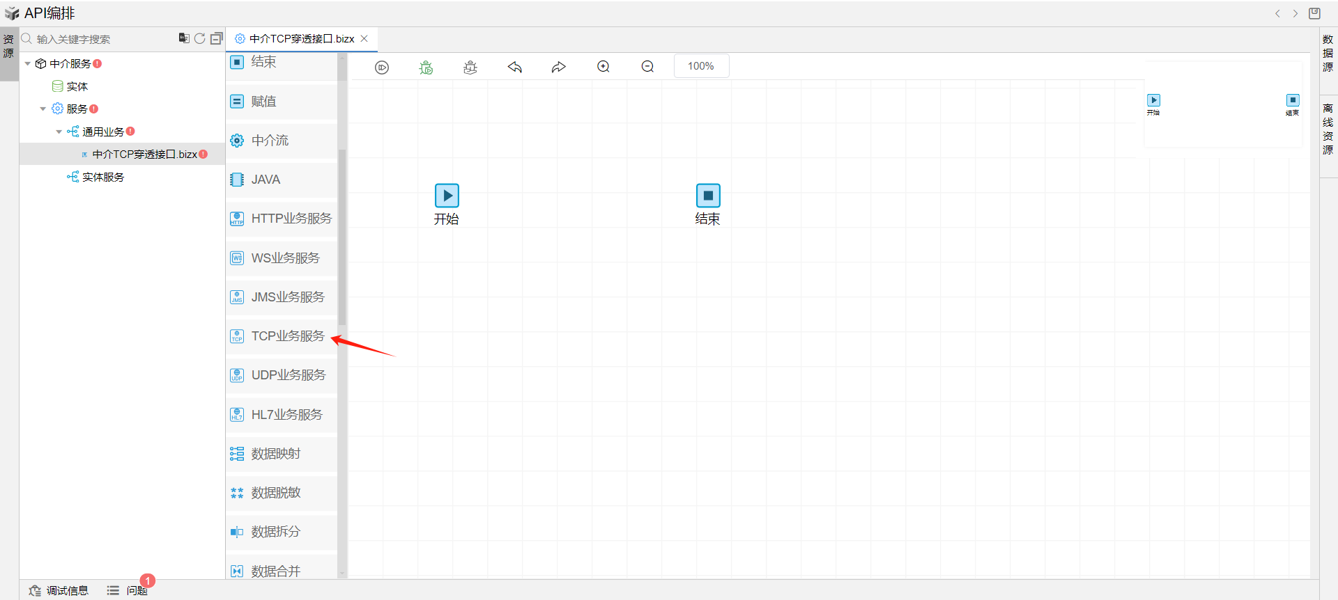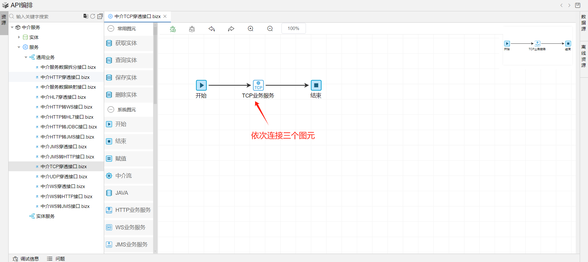 保存成功后系统自动打开中介编排页面。从左侧拖一个TCP业务服务图元到开始和结束图元中间,并依次连接各个图元。如下图: