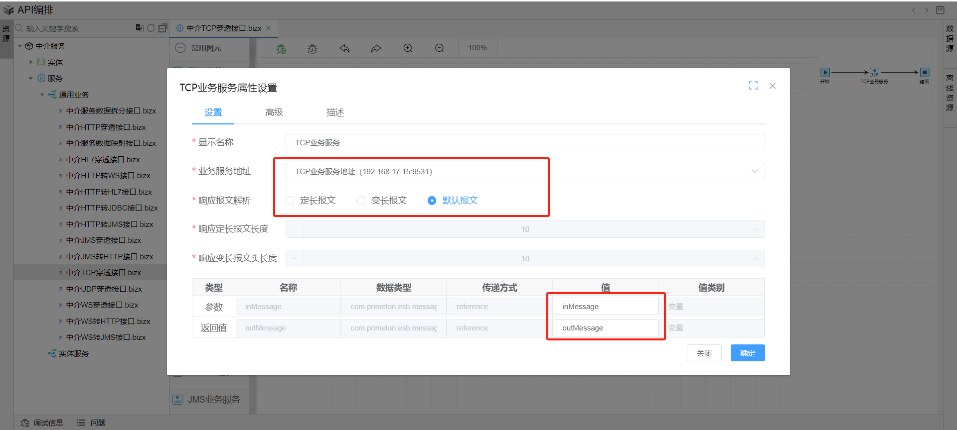 双击打开TCP业务服务图元,业务地址下拉框选择中介TCP业务服务地址,其他参数保持默认即可,下方表格中的参数和返回值分别选择inMessage和outMessage,然后点击确定按钮关闭对话框。如下图: