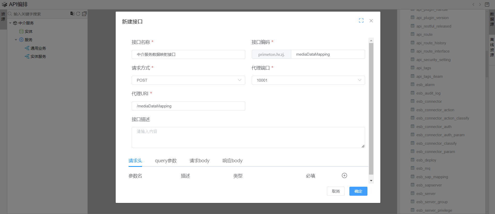 选择左侧树上中介服务节点,点击右侧的API创建按钮,选择”API编排“页签,点击”API编排“按钮,进入在线编排页面。