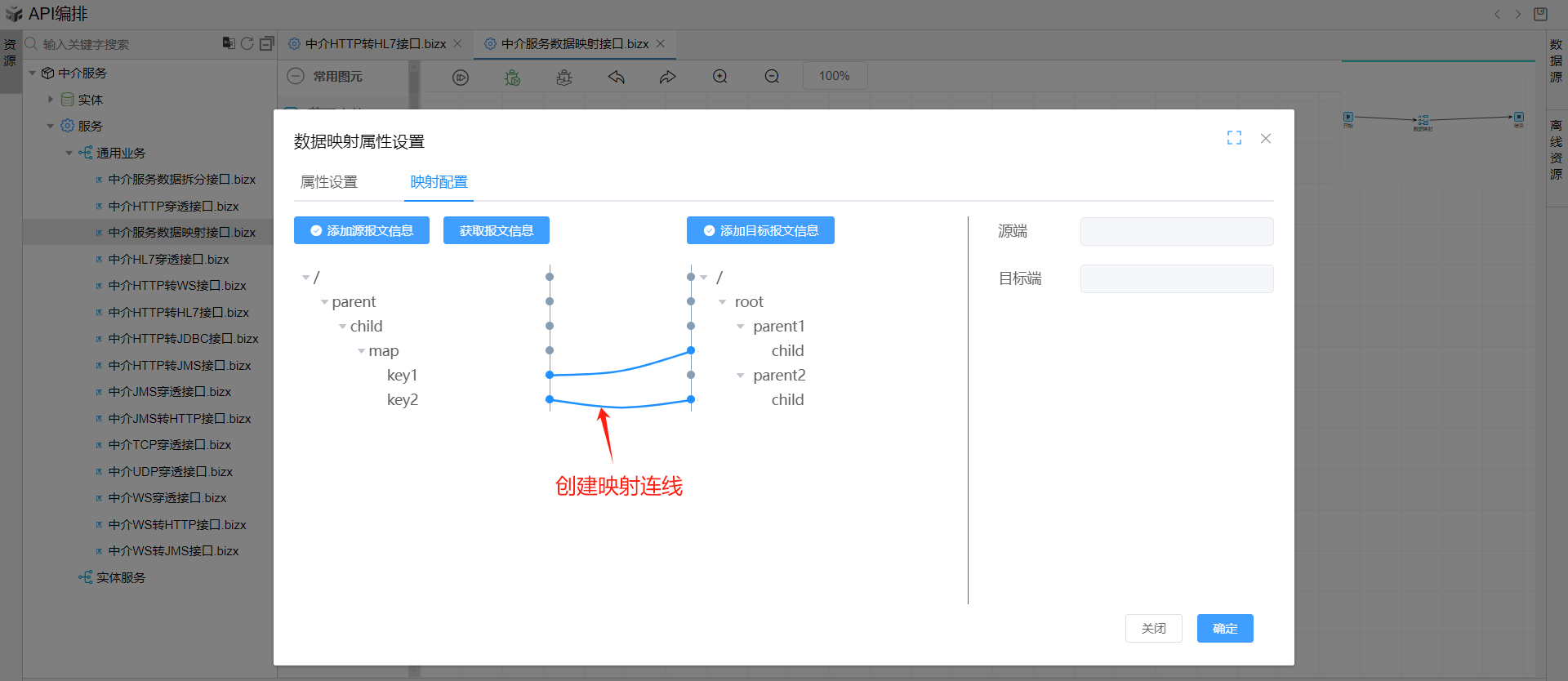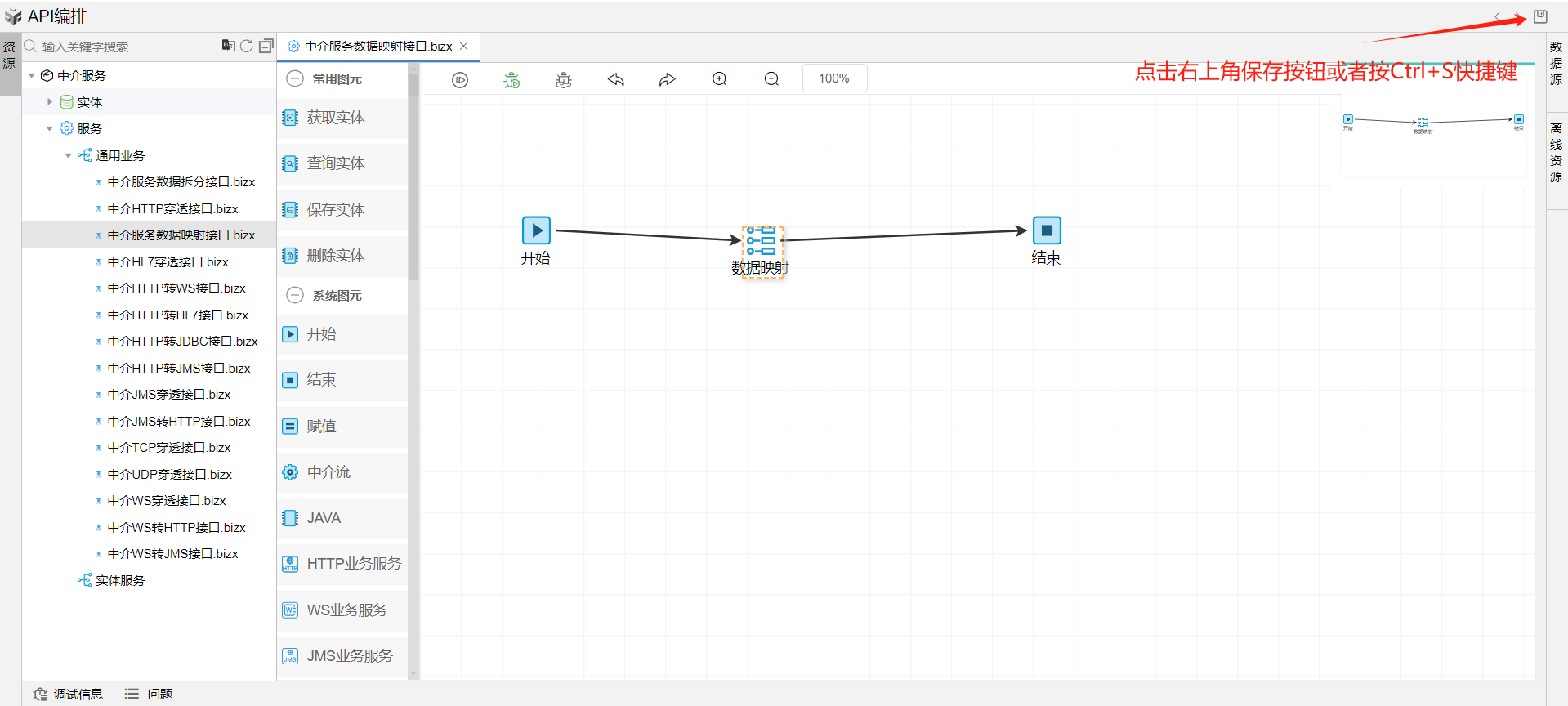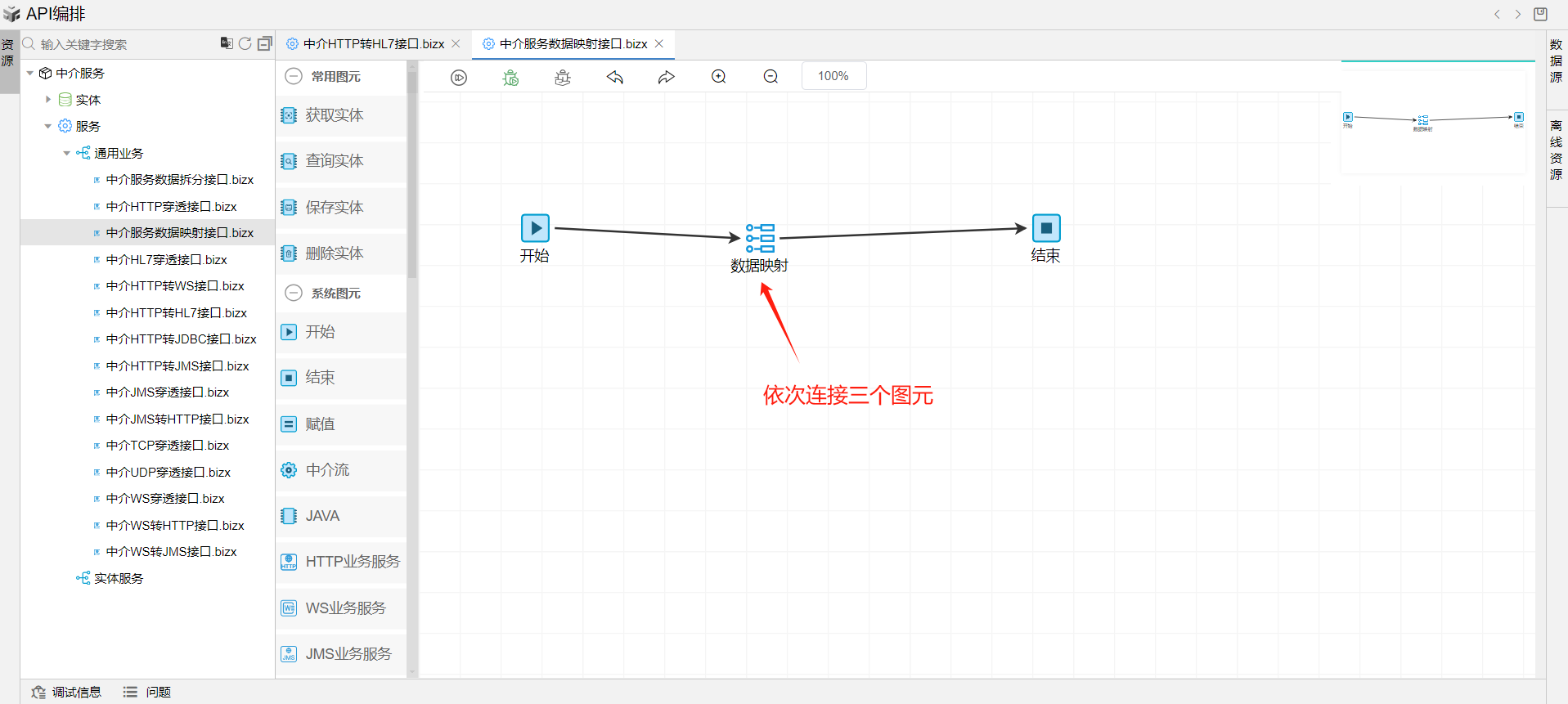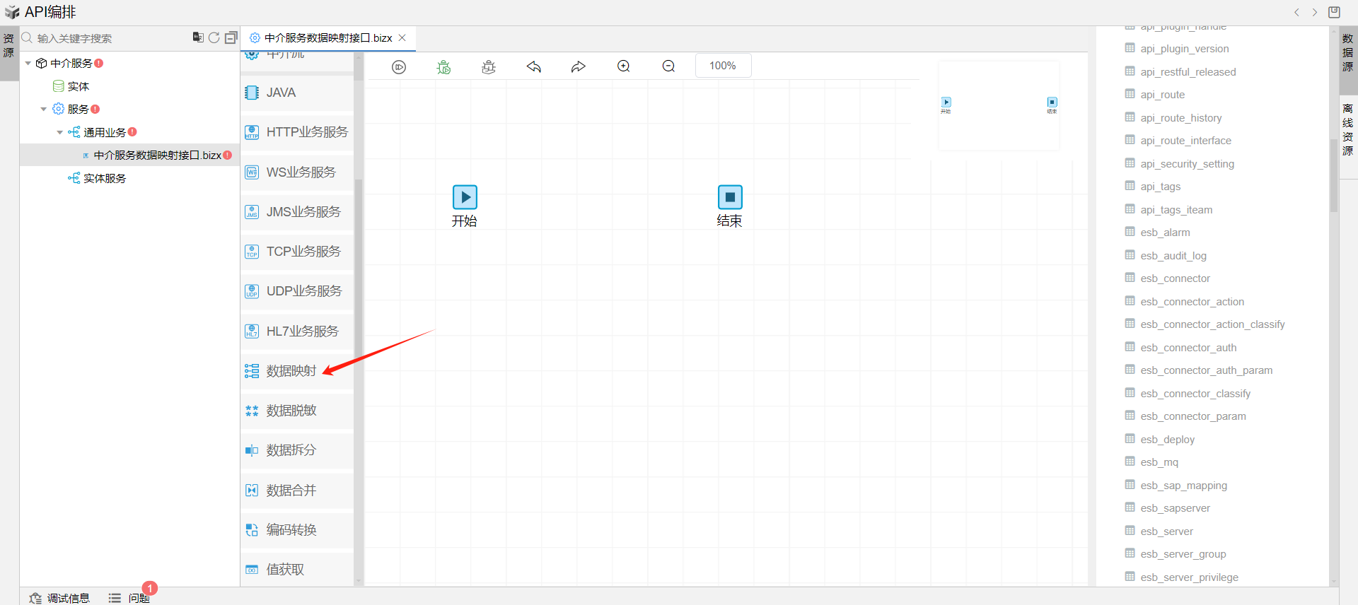 保存成功后系统自动打开中介编排页面。从左侧拖一个数据映射图元到开始和结束中间,并依次连接各个图元。如下图: