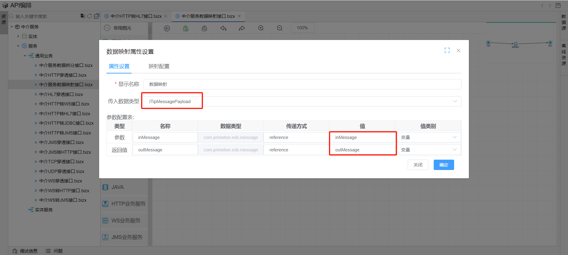 双击打开数据映射图元,在属性设置tab页,填写参数和返回值。如下图: