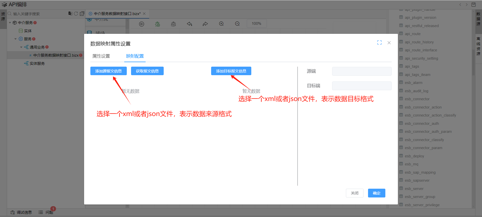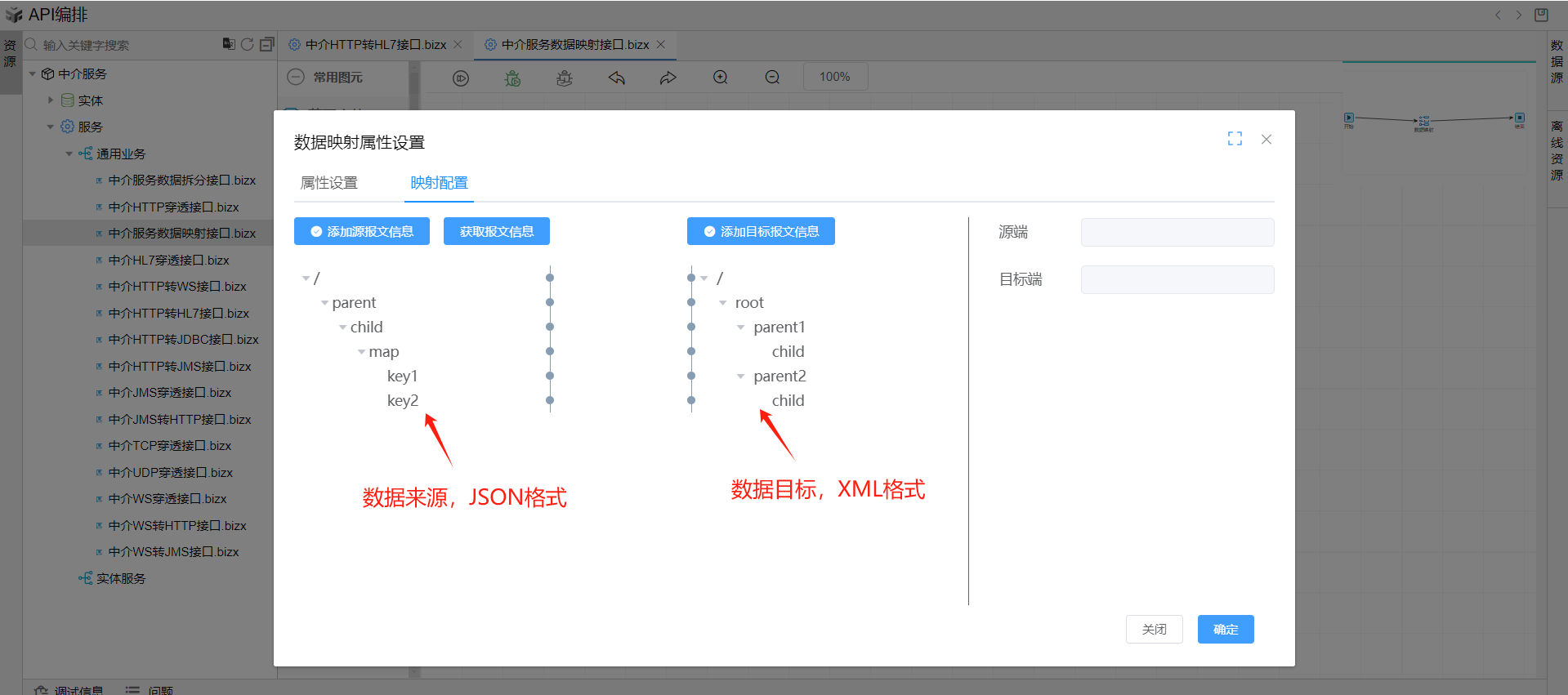 示例来源格式文件:数据来源JSON格式.json; 示例目标格式文件:数据目标XML格式.xml; 分别点击左右两侧的选取按钮,将来源格式和目标格式传入页面。如下图: