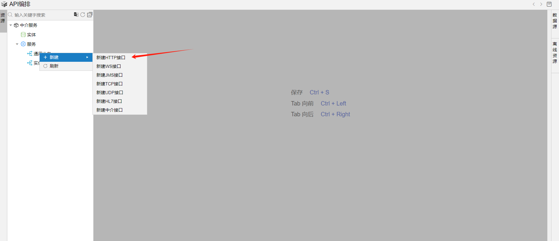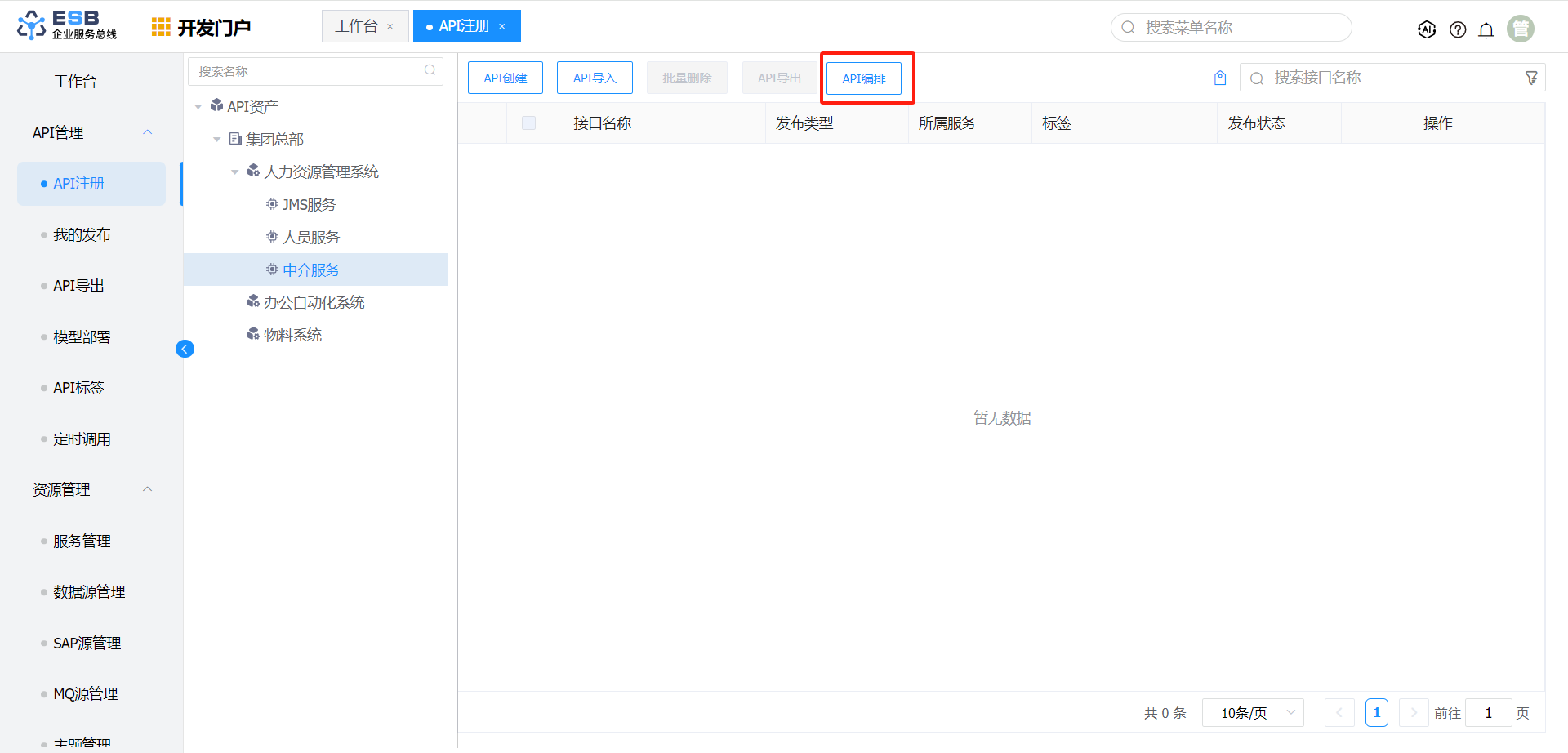 选择左侧树上中介服务节点,点击右侧的API创建按钮,选择”API编排“页签,点击”API编排“按钮,进入在线编排页面。