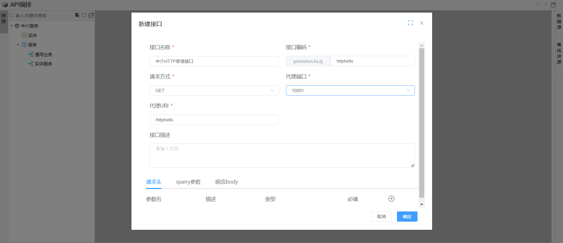 在线编排页面中的通用业务目录上点击右键,点击新建后点击新建HTTP接口,然后如下图所示填写数据并点击保存确定。