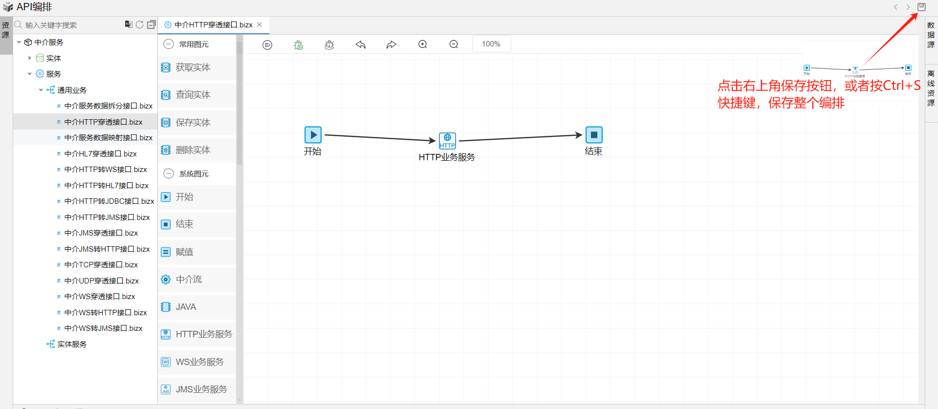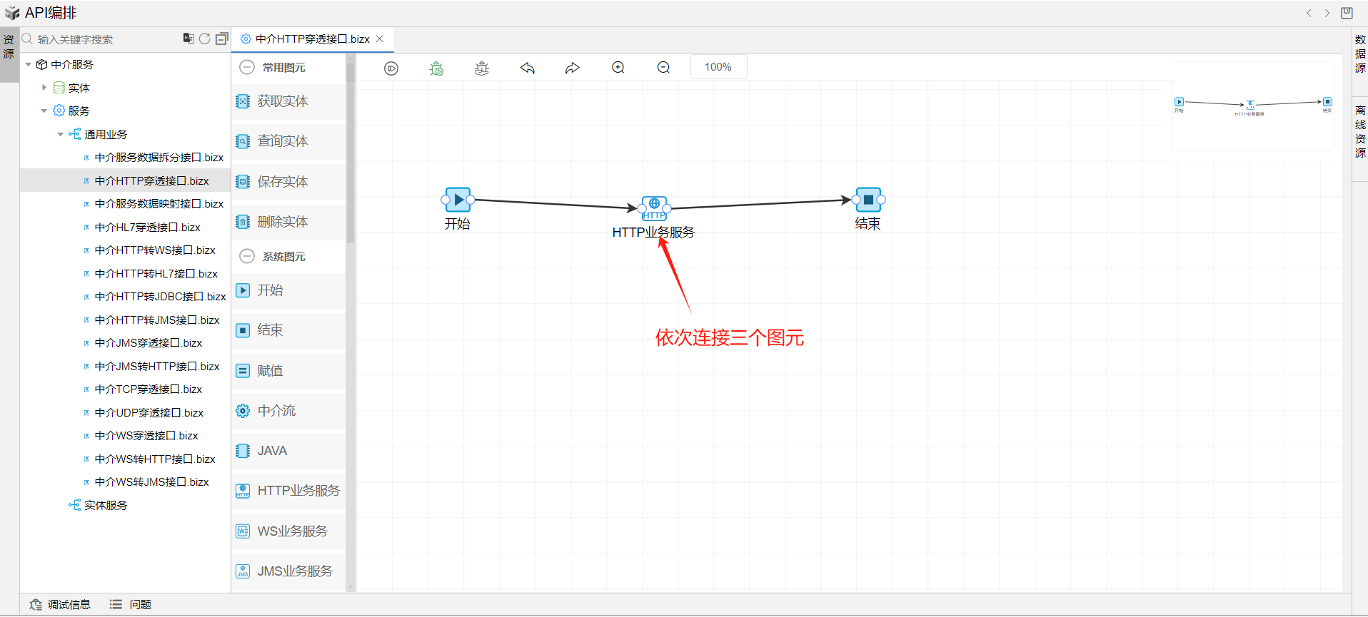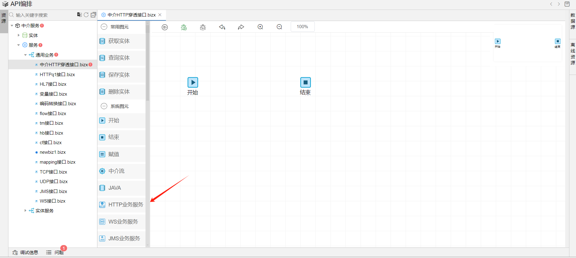 保存成功后,系统自动打开中介编排页面,如下图所示。从左侧拖一个HTTP业务服务图元到开始和结束图元中间,并依次连接各个图元。如下图: