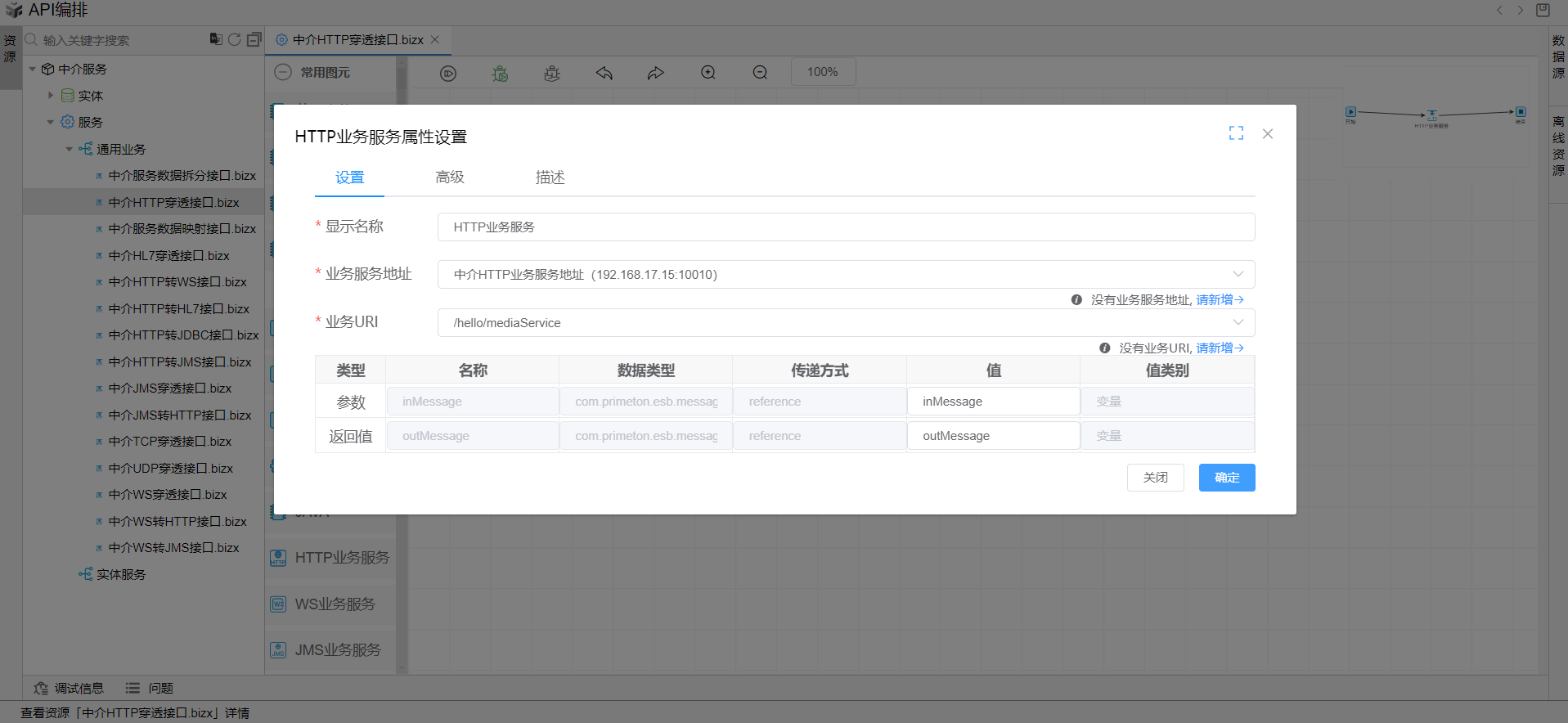 双击打开HTTP业务服务图元,业务地址下拉框选择中介HTTP业务服务地址,业务url下拉框选择/hello/mediaService,下方表格中的参数和返回值分别选择inMessage和outMessage,然后点击确定按钮关闭对话框。如下图: