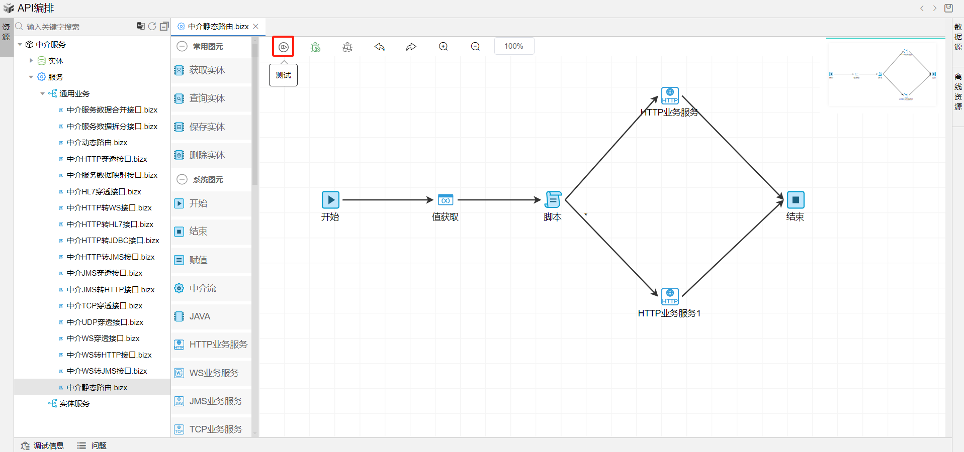 1. 在线编排页面保存成功后,点击界面上方的测试按钮,如下图: