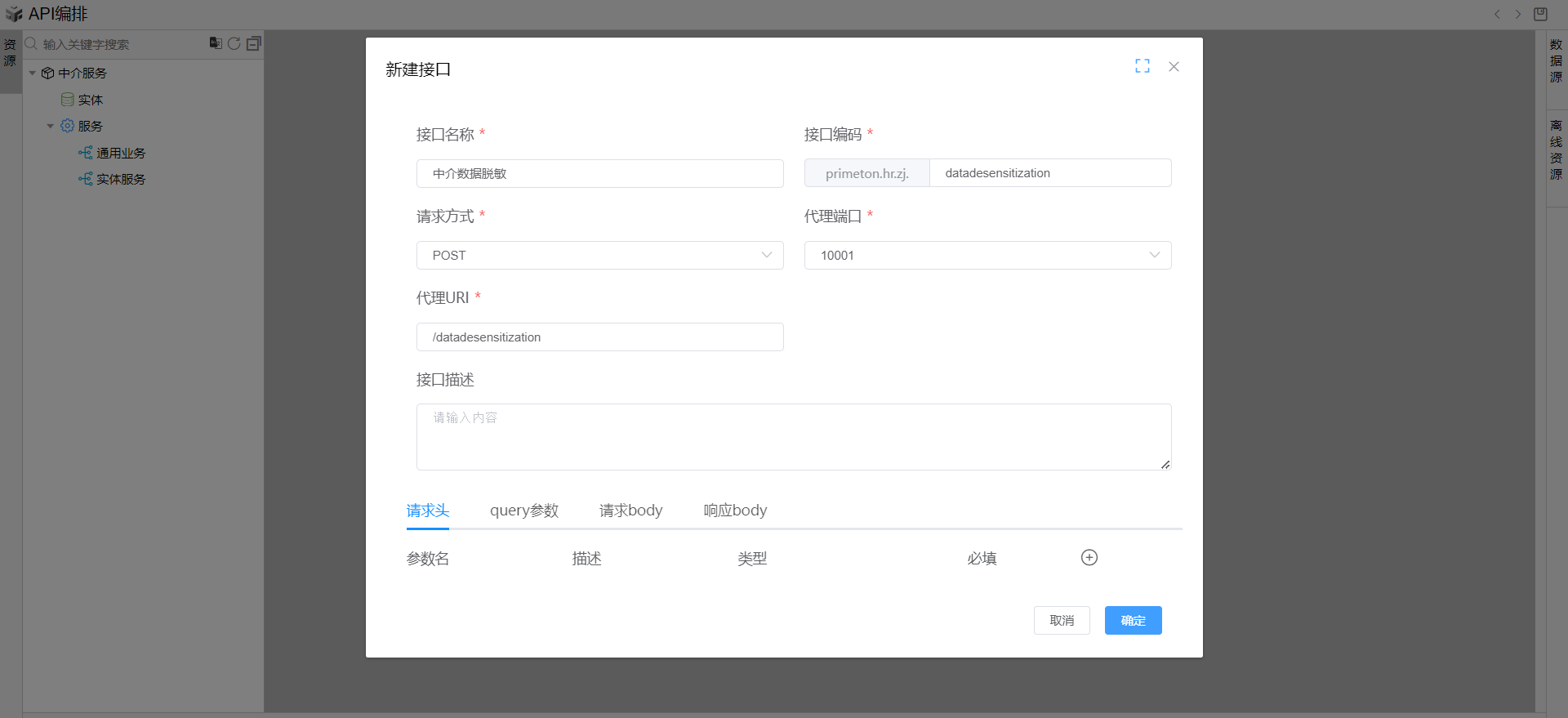 在线编排页面中,在通用业务目录上点击右键,点击新建并点击新建HTTP接口,然后如下图所示填写数据并点击保存确定。