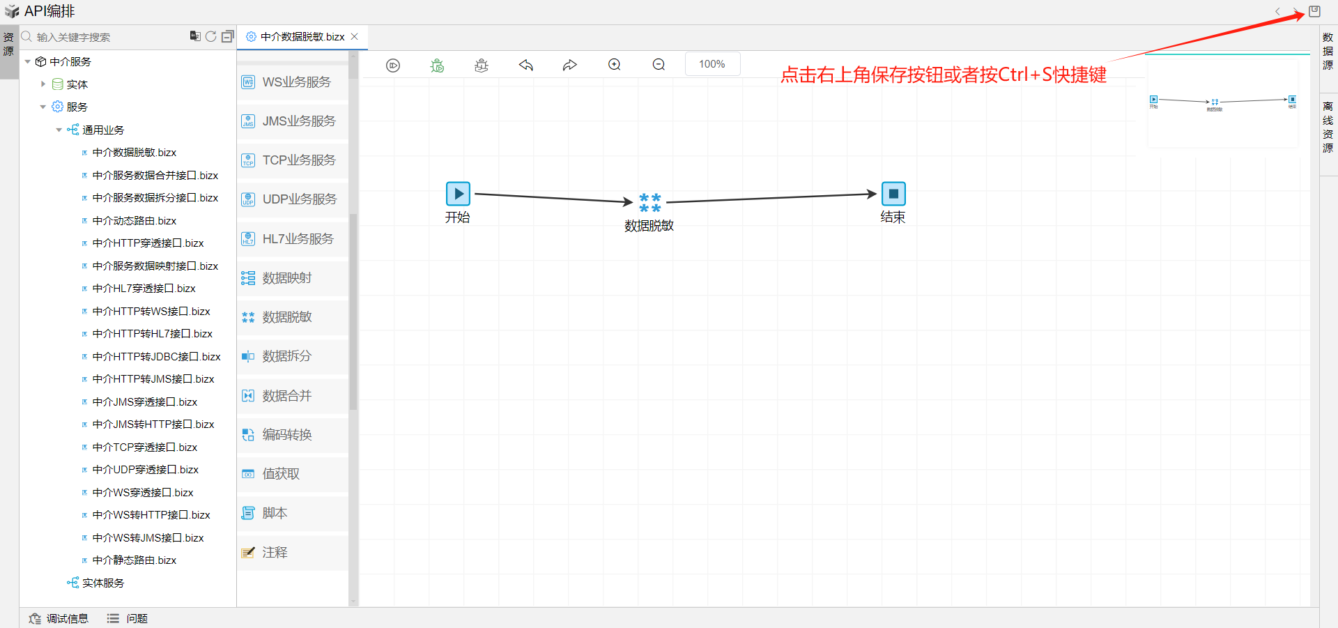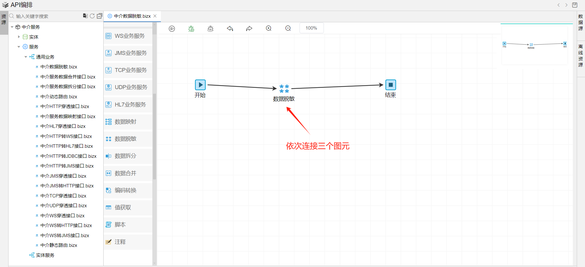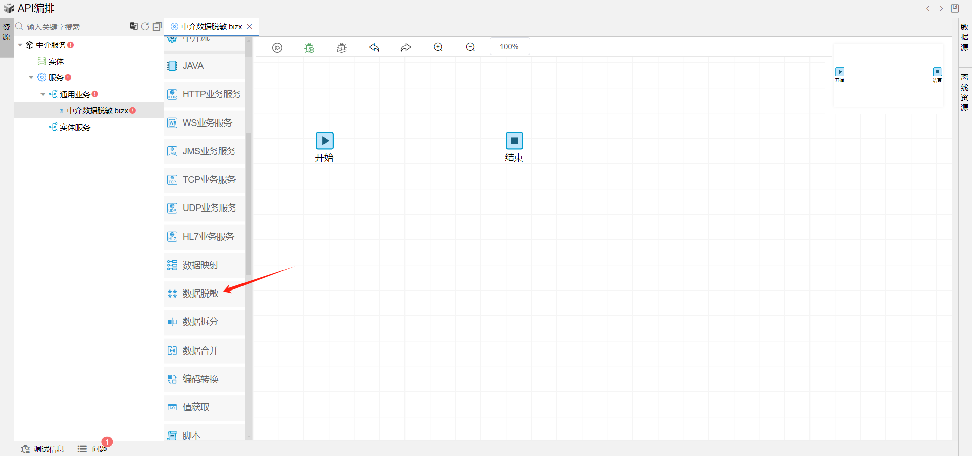 保存成功后系统自动打开中介编排页面。从左侧拖一个数据脱敏图元到开始和结束中间,并依次连接各个图元。如下图:
