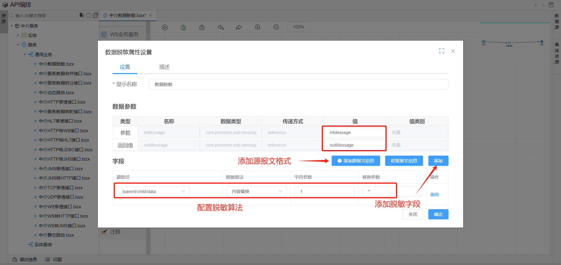 双击打开数据脱敏图元,设置输入和返回值变量,添加报文格式如下: