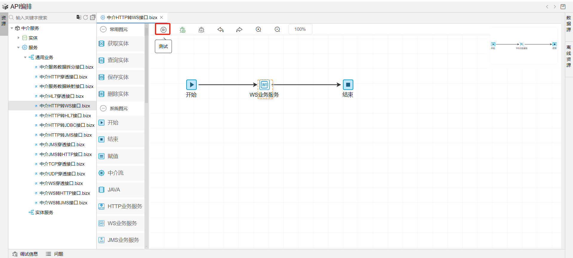在线编排页面保存成功后,点击界面上方的测试按钮,如下图: