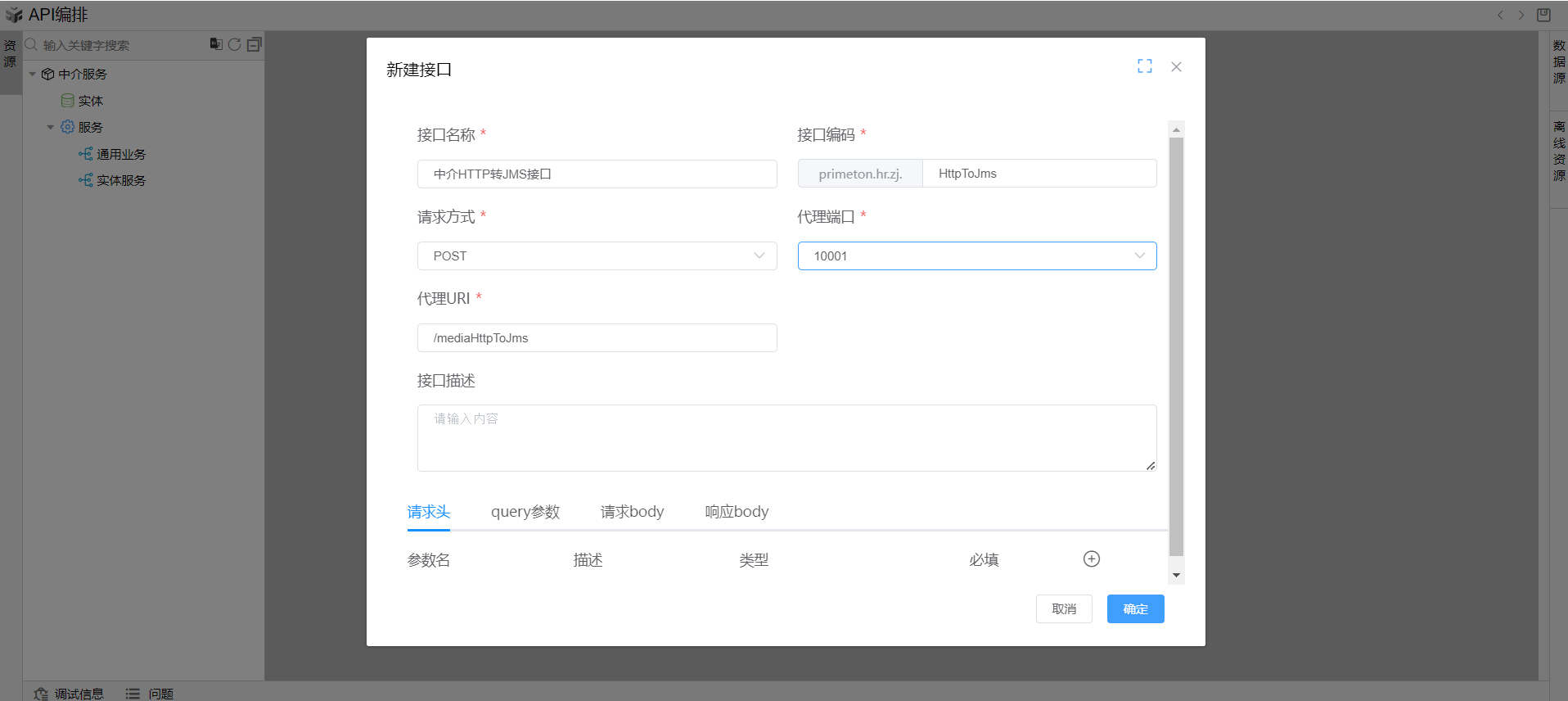 在线编排页面中,在通用业务目录上点击右键,点击新建,点击新建HTTP接口,然后如下图所示填写数据并点击保存确定。