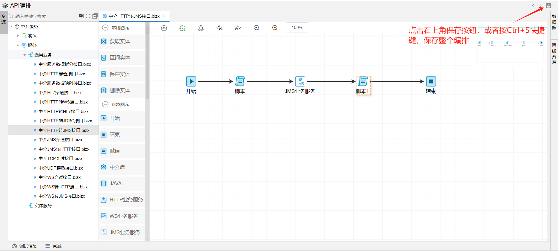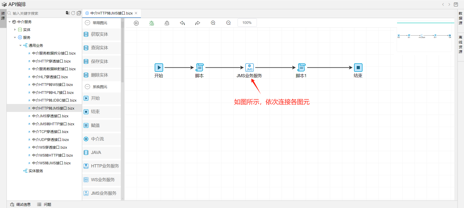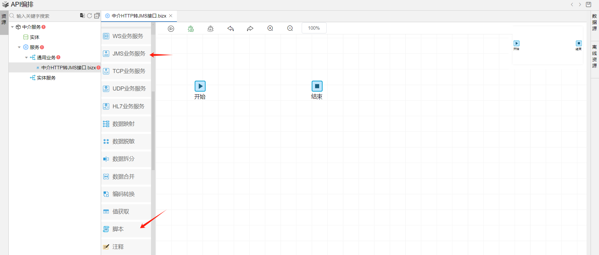 保存成功后系统自动打开中介编排页面,如下图所示。从左侧拖2个脚本图元和一个JMS业务服务图元到开始和结束图元中间并依次连接各个图元。如下图: