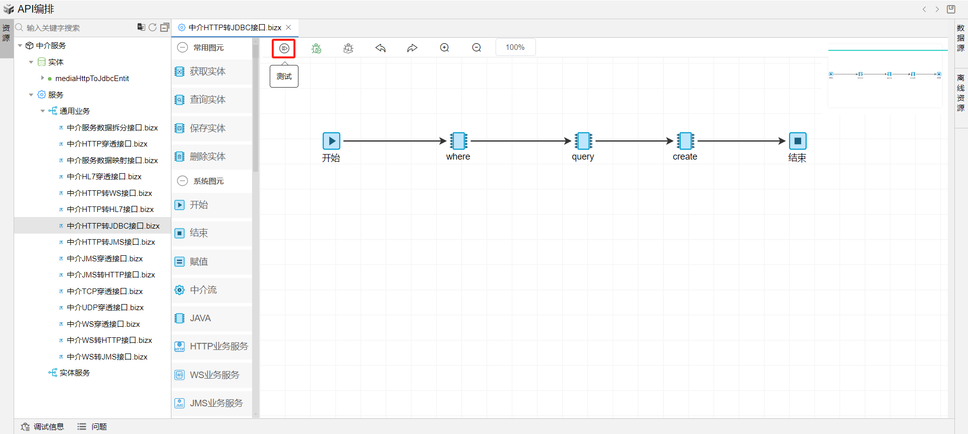 在线编排页面保存成功后,点击界面上方的测试按钮,如下图: