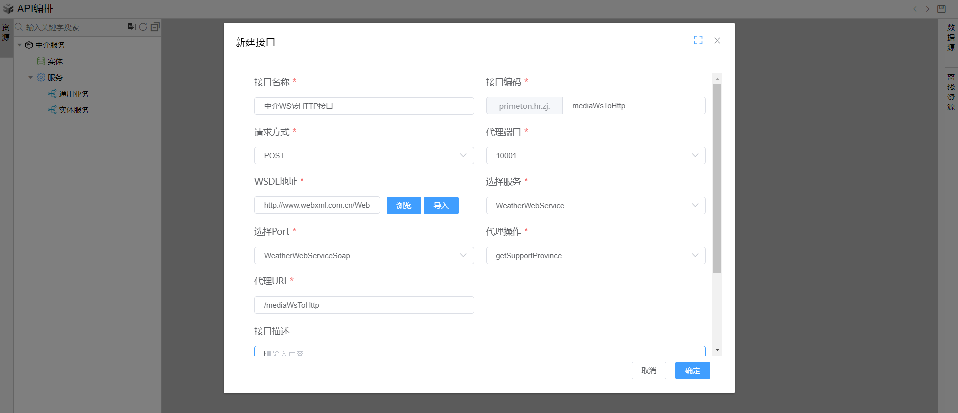 选择左侧树上中介服务节点,点击右侧的API创建按钮,选择”API编排“页签,点击”API编排“按钮,进入在线编排页面。