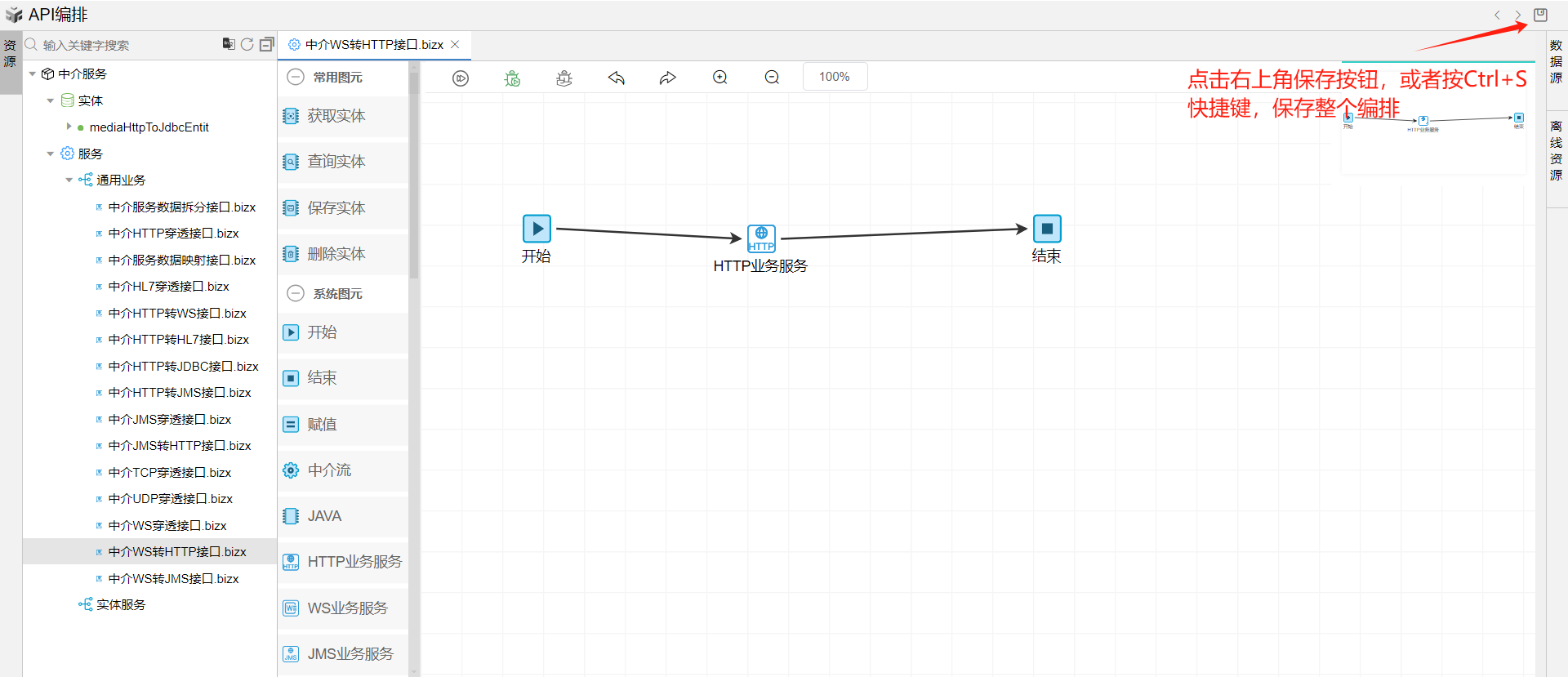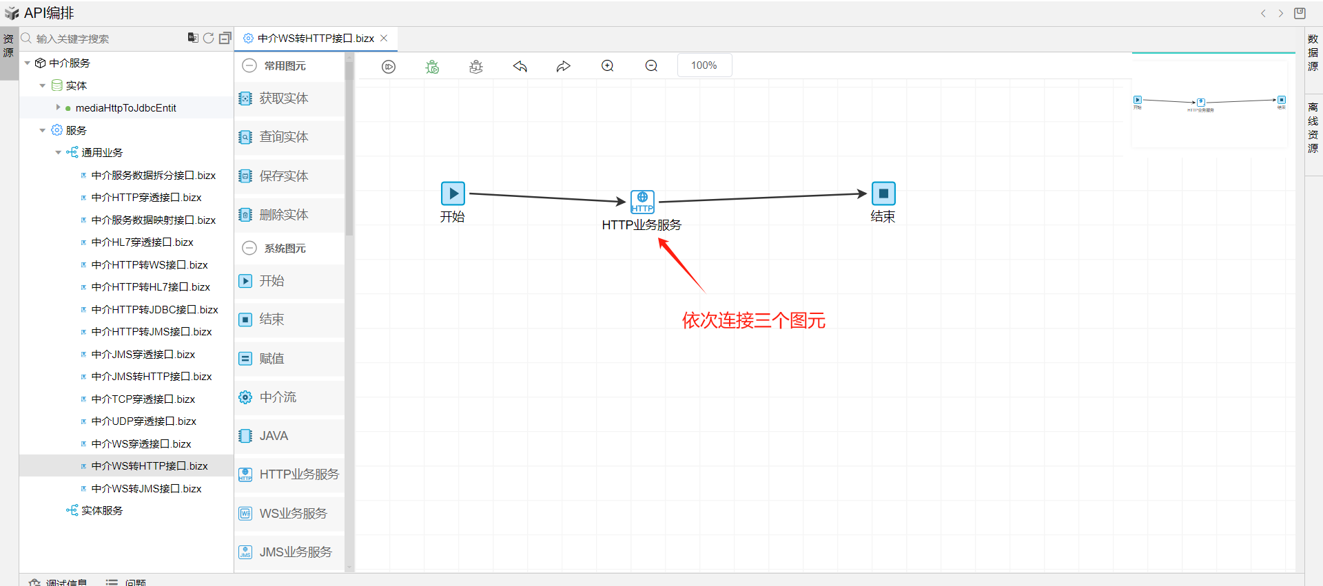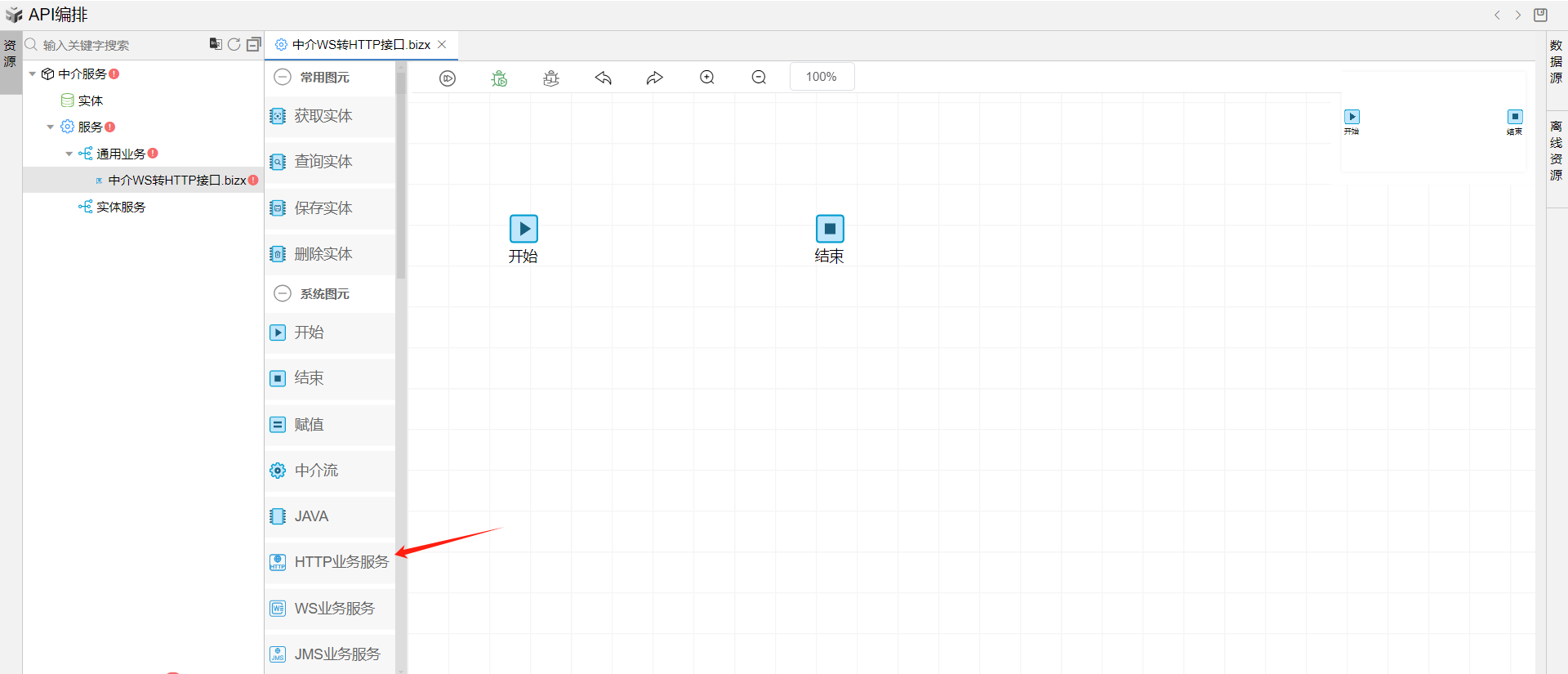 保存成功后,系统自动打开中介编排页面,从左侧拖一个HTTP业务服务图元到开始和结束图元中间,并依次连接各个图元。如下图: