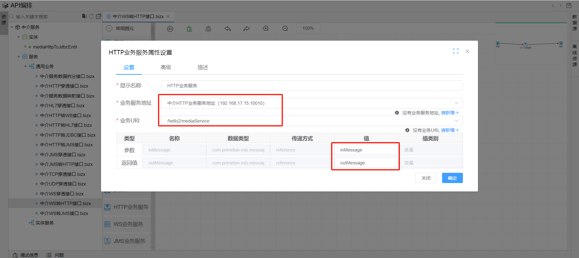 双击打开HTTP业务服务图元后业务地址下拉框选择中介HTTP业务服务地址,业务url下拉框选择**/hello/mediaService**,下方表格中的参数和返回值分别选择inMessage和outMessage,然后点击确定按钮关闭对话框。如下图: